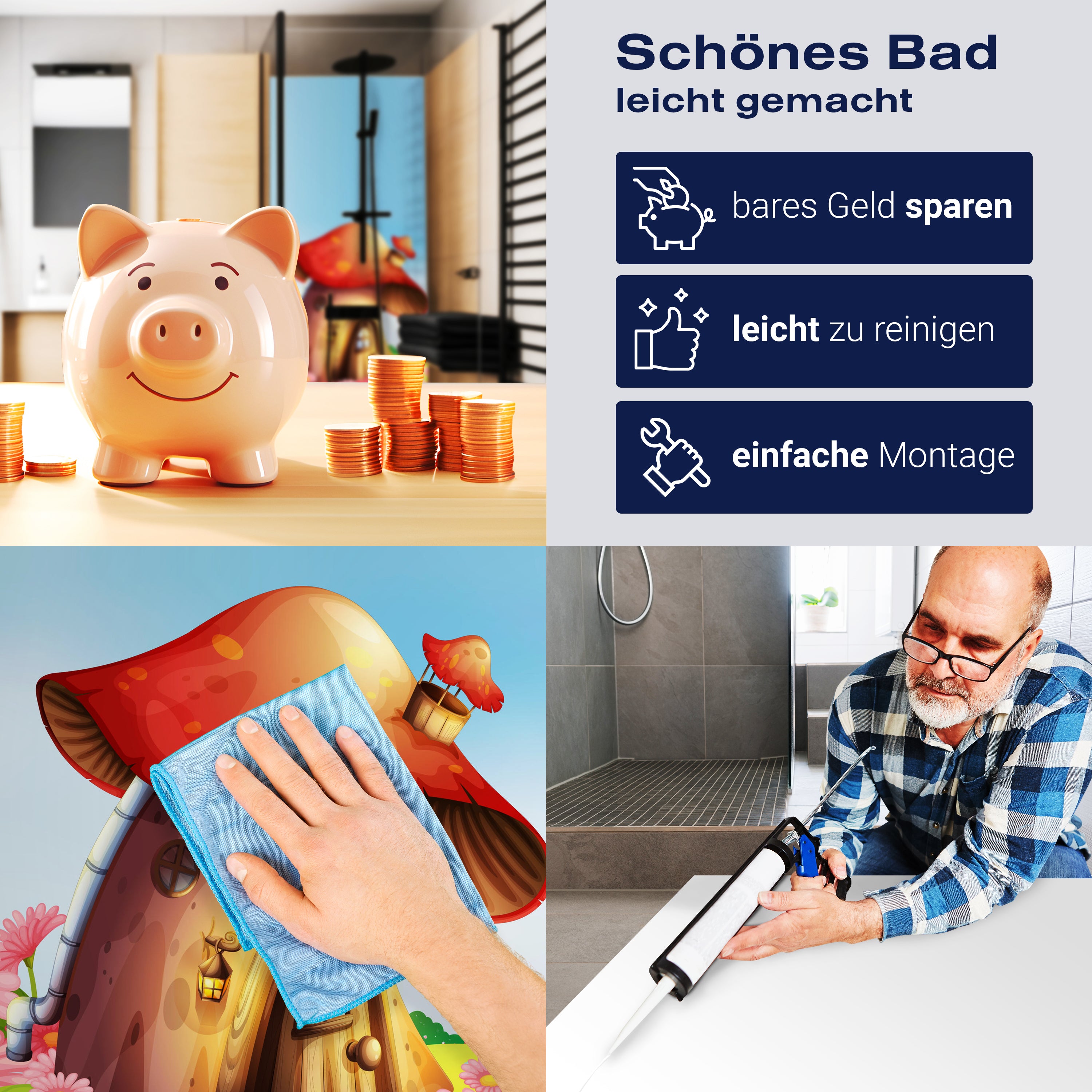 Die Reinigung Deiner Duschwand war noch nie so einfach. In einer Welt, in der Zeit ein kostbares Gut ist, verstehen wir, wie wichtig es ist, Reinigungsprozesse so effizient und mühelos wie möglich zu gestalten. Unsere Duschwände sind speziell dafür entworfen, Dein Leben leichter zu machen. Dank der glatten Oberfläche und der widerstandsfähigen Beschichtung lassen sich Spritzer und Flecken ohne großen Aufwand entfernen – ein schneller Wisch mit einem handelsüblichen Lappen, Spül- oder Wischtuch, und Deine Rückwand sieht aus wie neu.