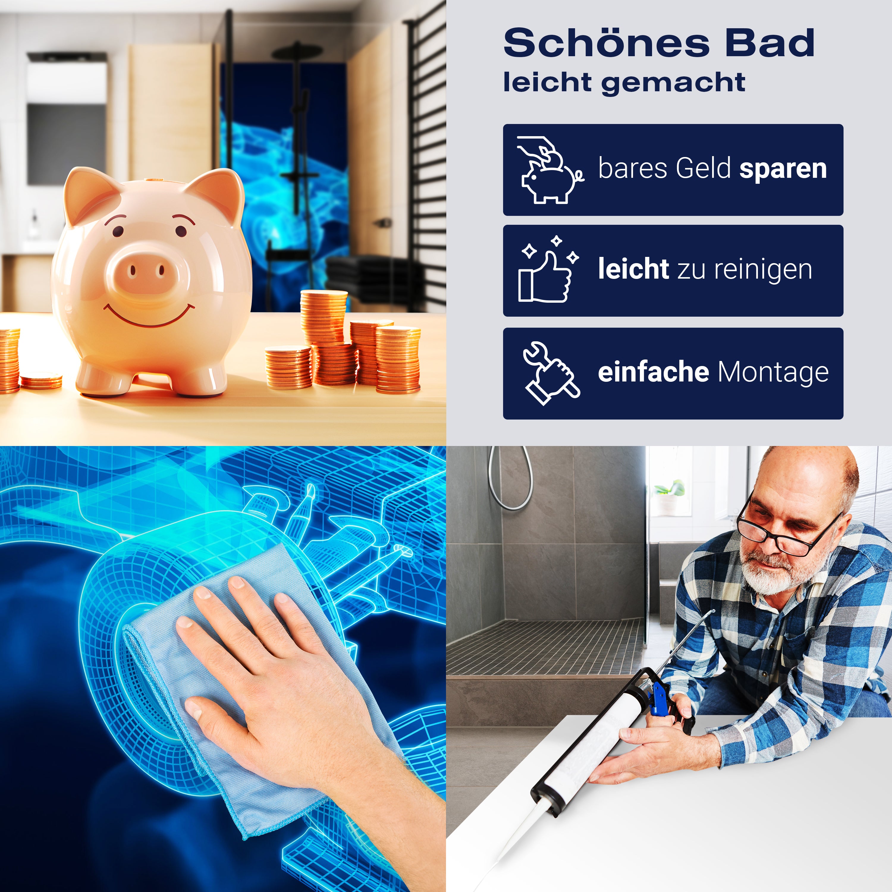 Diese Materialien bieten im Vergleich zu traditionellen Fliesen mehrere Vorteile. Sie haben eine fugenlose Oberfläche, was bedeutet, dass sie weniger anfällig für Schimmelbildung und leichter zu reinigen sind, da sich Schmutz und Kalk nicht in Fugen festsetzen können. Darüber hinaus ermöglichen sie eine schnelle und einfache Renovierung, da sie direkt über bestehenden Fliesen montiert werden können, was Zeit und Kosten spart