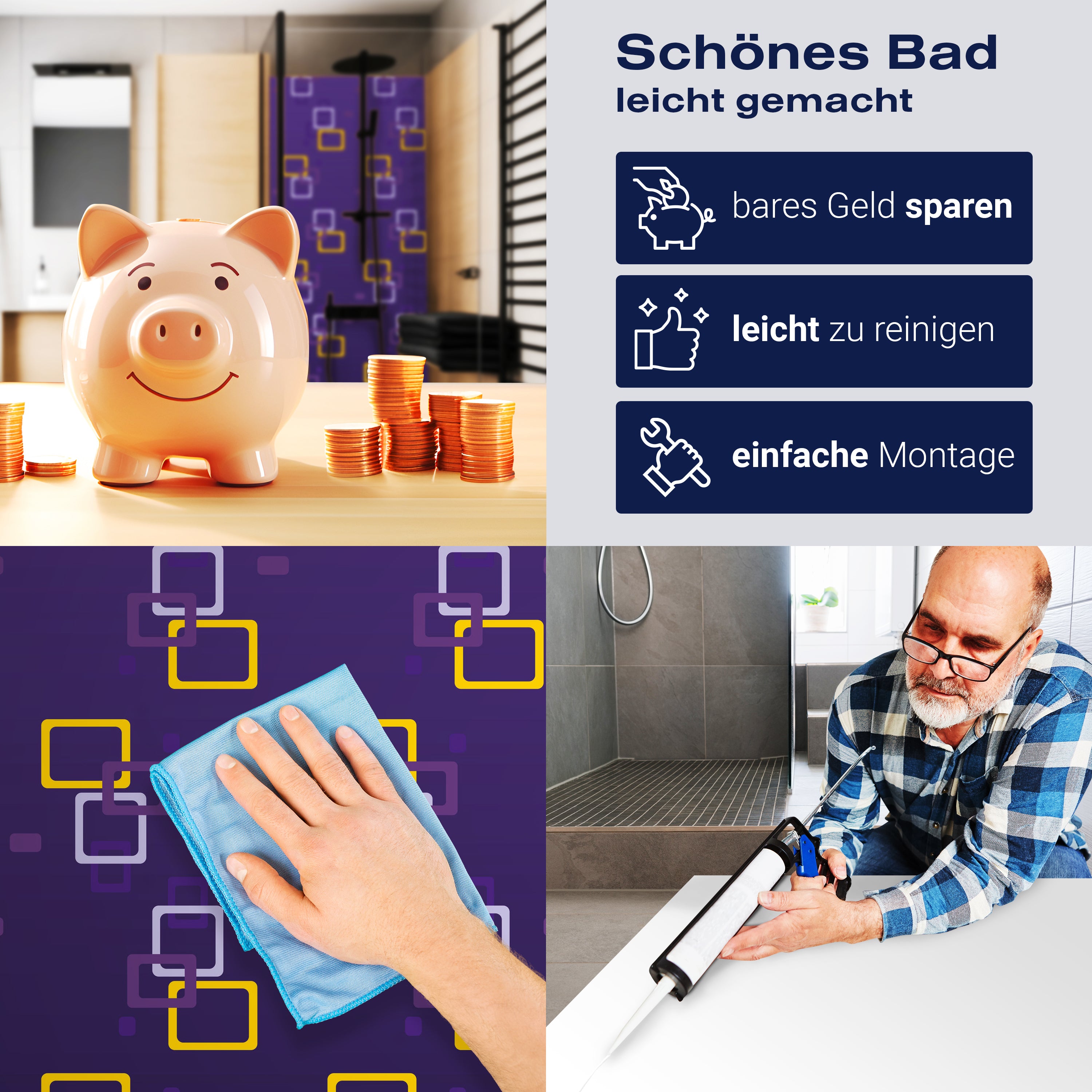 Die Reinigung Deiner Duschwand war noch nie so einfach. In einer Welt, in der Zeit ein kostbares Gut ist, verstehen wir, wie wichtig es ist, Reinigungsprozesse so effizient und mühelos wie möglich zu gestalten. Unsere Duschwände sind speziell dafür entworfen, Dein Leben leichter zu machen. Dank der glatten Oberfläche und der widerstandsfähigen Beschichtung lassen sich Spritzer und Flecken ohne großen Aufwand entfernen – ein schneller Wisch mit einem handelsüblichen Lappen, Spül- oder Wischtuch, und Deine Rückwand sieht aus wie neu.