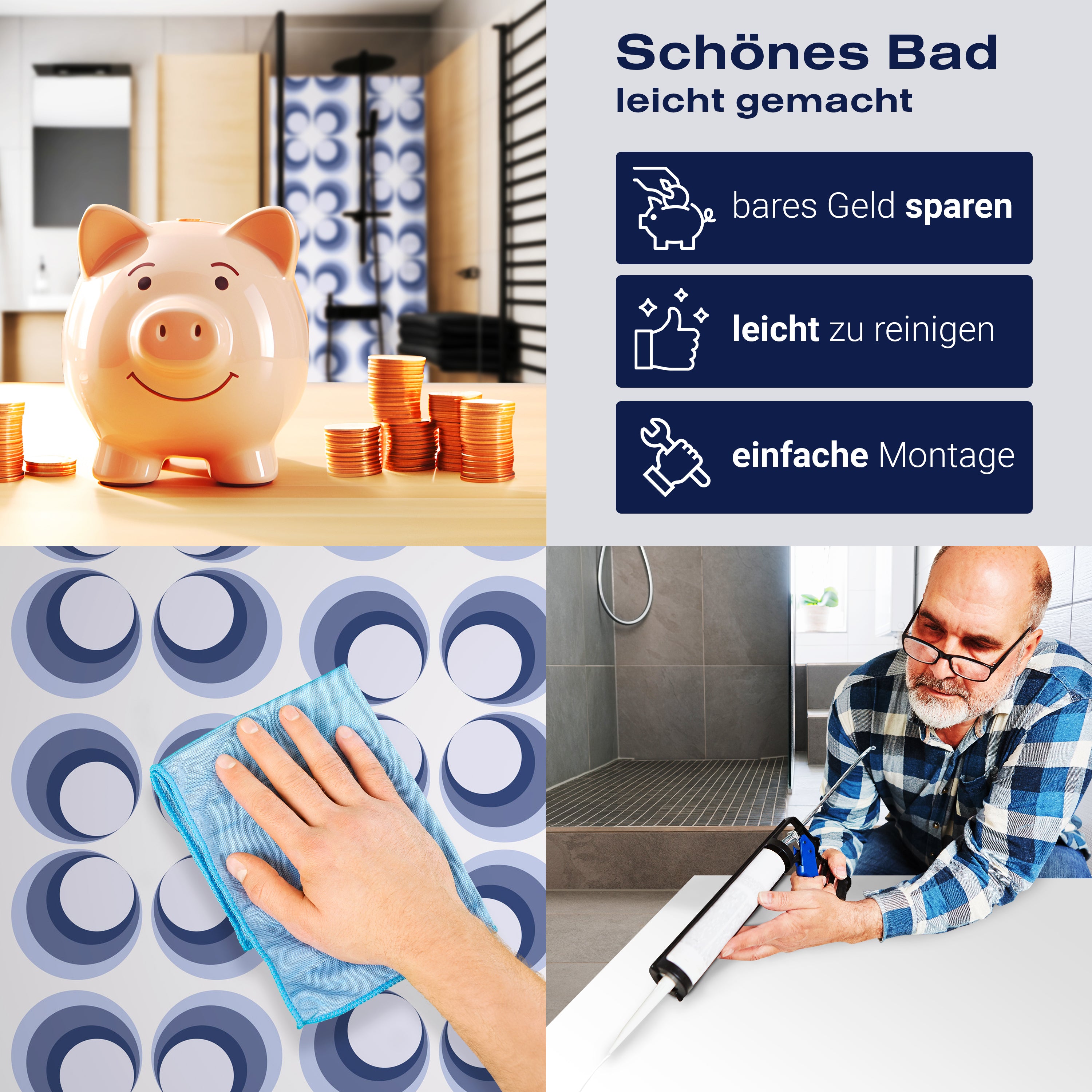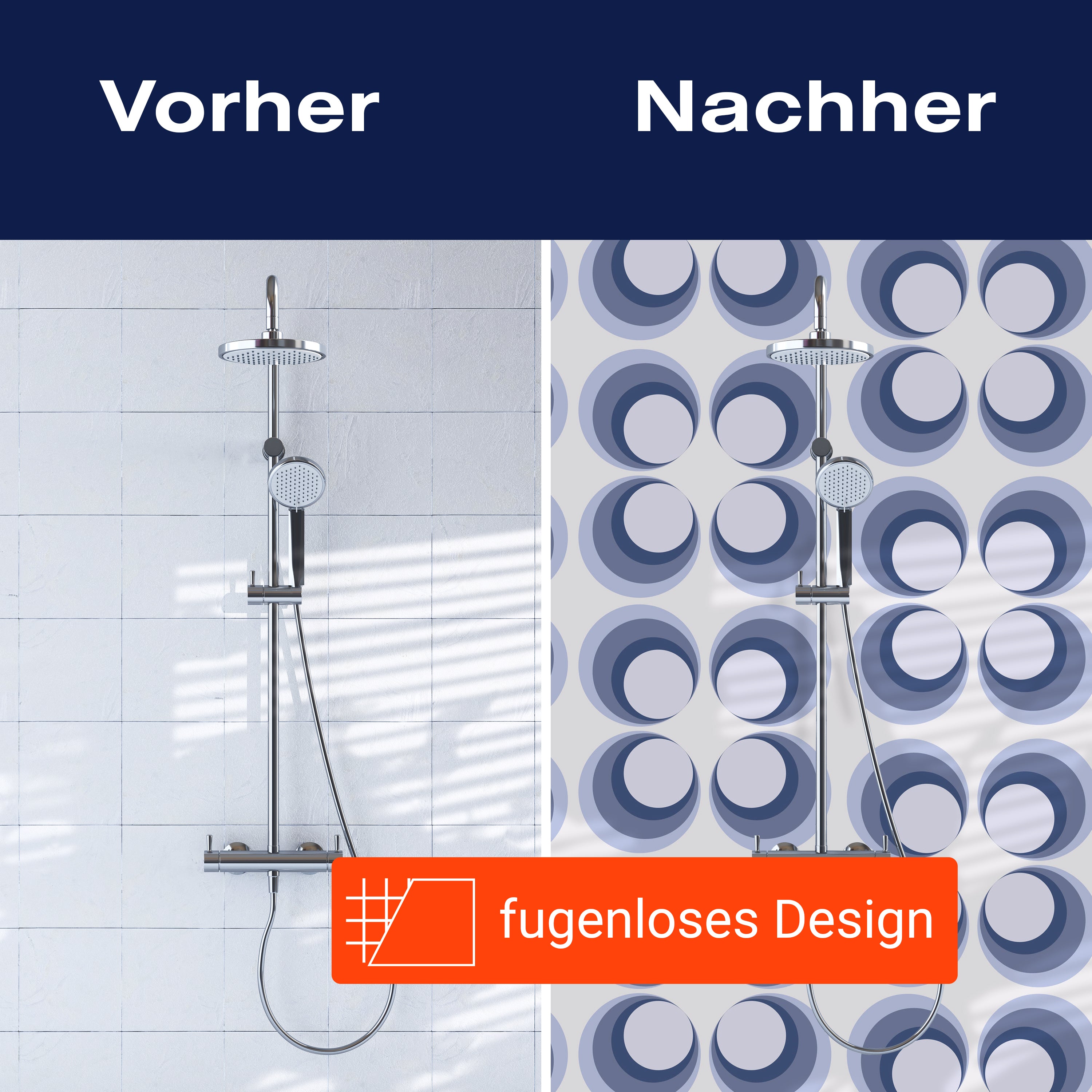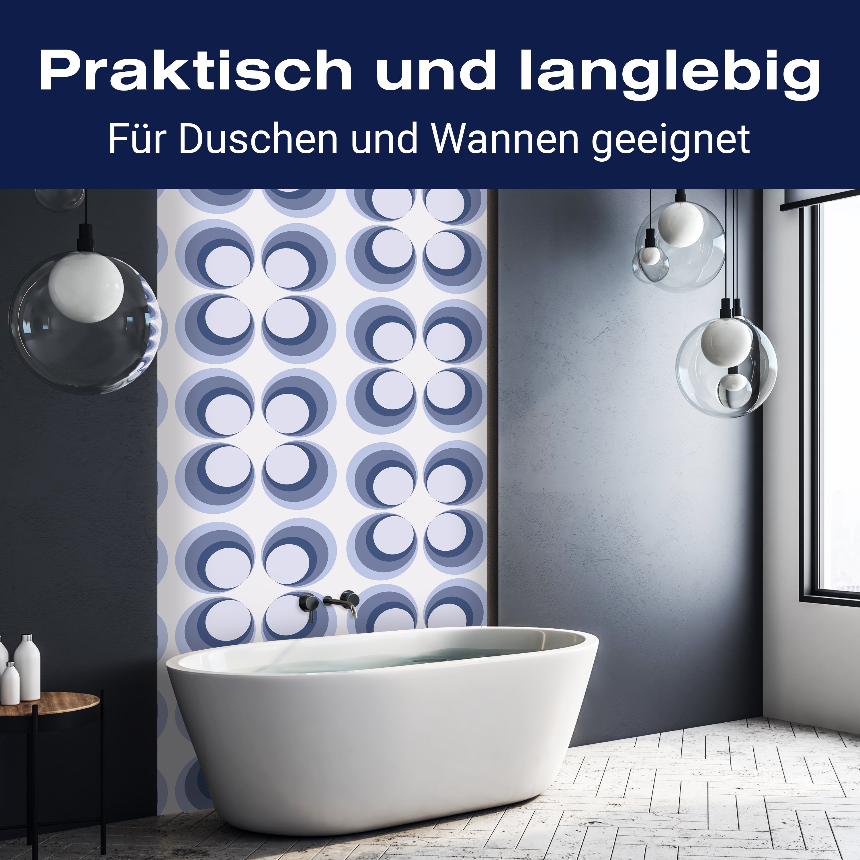 Bist du es leid, auf die langweiligen, schwer zu reinigende Fliesen in deiner Dusche zu schauen? Stell dir vor, wie dein Bad mit einer stilvollen, modernen Rückwand zum Leben erwacht! Unsere Duschwand 'Retrokreise Blau Muster' ist nicht nur ein optisches Highlight, sondern auch praktisch und pflegeleicht.