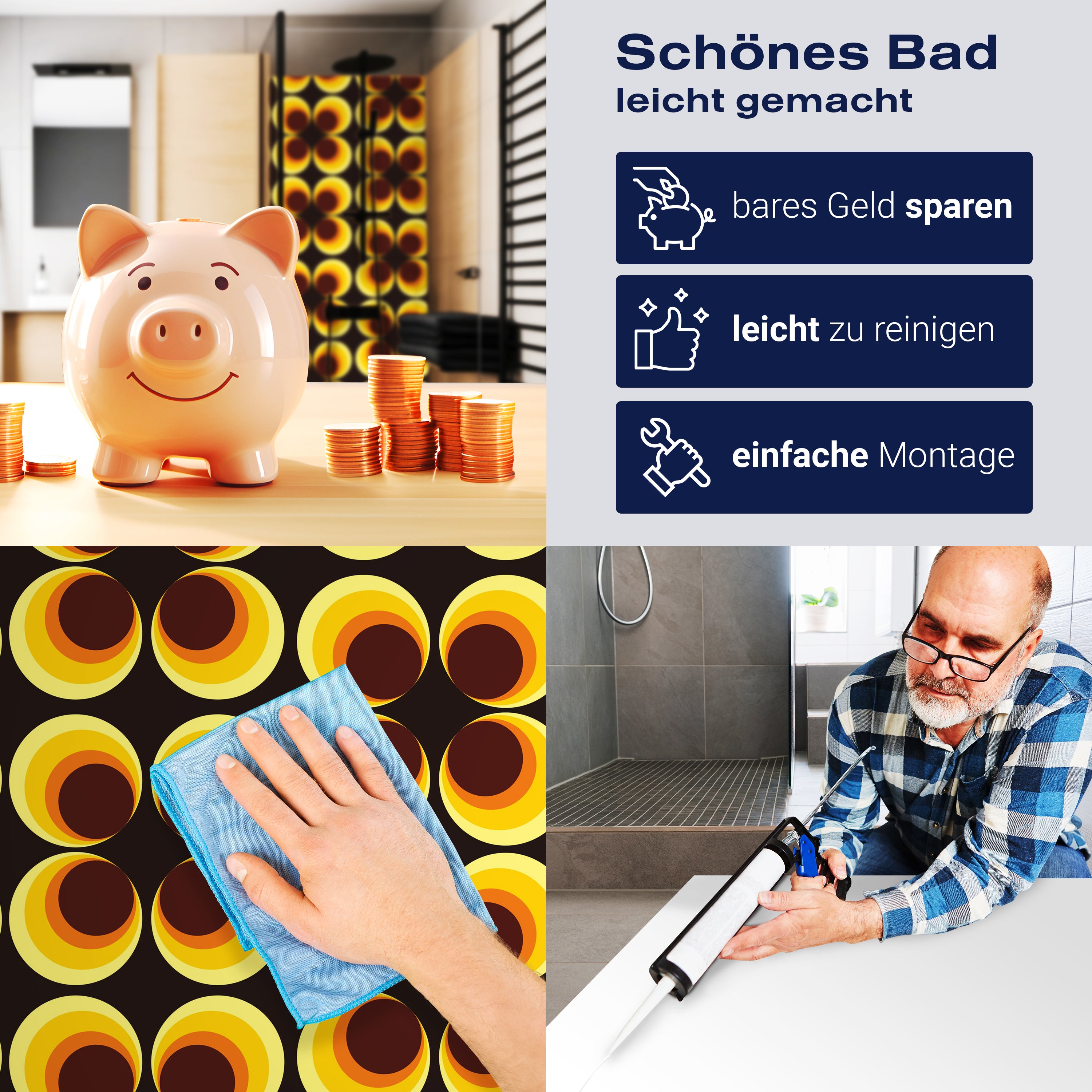 Die Reinigung Deiner Duschwand war noch nie so einfach. In einer Welt, in der Zeit ein kostbares Gut ist, verstehen wir, wie wichtig es ist, Reinigungsprozesse so effizient und mühelos wie möglich zu gestalten. Unsere Duschwände sind speziell dafür entworfen, Dein Leben leichter zu machen. Dank der glatten Oberfläche und der widerstandsfähigen Beschichtung lassen sich Spritzer und Flecken ohne großen Aufwand entfernen – ein schneller Wisch mit einem handelsüblichen Lappen, Spül- oder Wischtuch, und Deine Rückwand sieht aus wie neu.