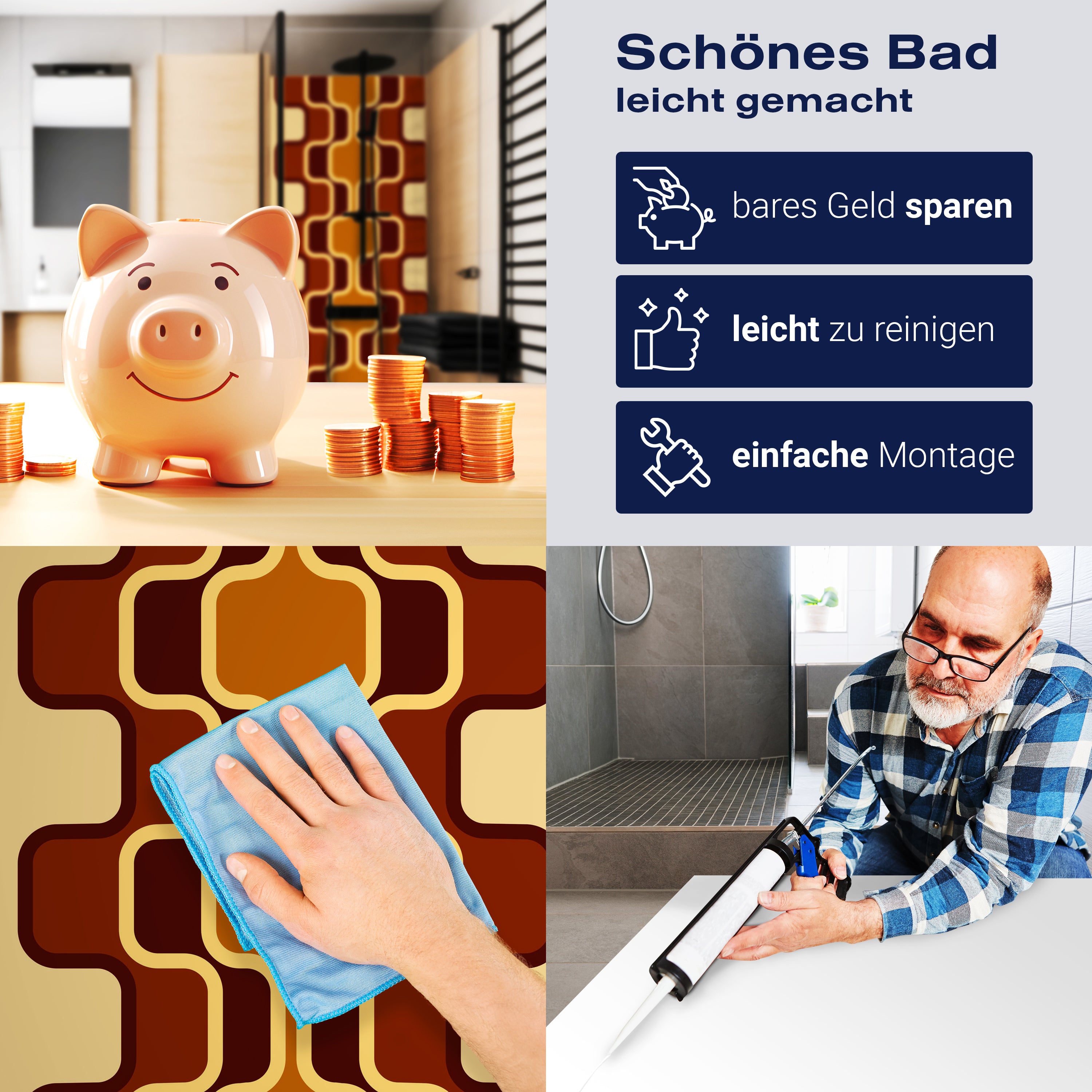 Die Reinigung Deiner Duschwand war noch nie so einfach. In einer Welt, in der Zeit ein kostbares Gut ist, verstehen wir, wie wichtig es ist, Reinigungsprozesse so effizient und mühelos wie möglich zu gestalten. Unsere Duschwände sind speziell dafür entworfen, Dein Leben leichter zu machen. Dank der glatten Oberfläche und der widerstandsfähigen Beschichtung lassen sich Spritzer und Flecken ohne großen Aufwand entfernen – ein schneller Wisch mit einem handelsüblichen Lappen, Spül- oder Wischtuch, und Deine Rückwand sieht aus wie neu.
