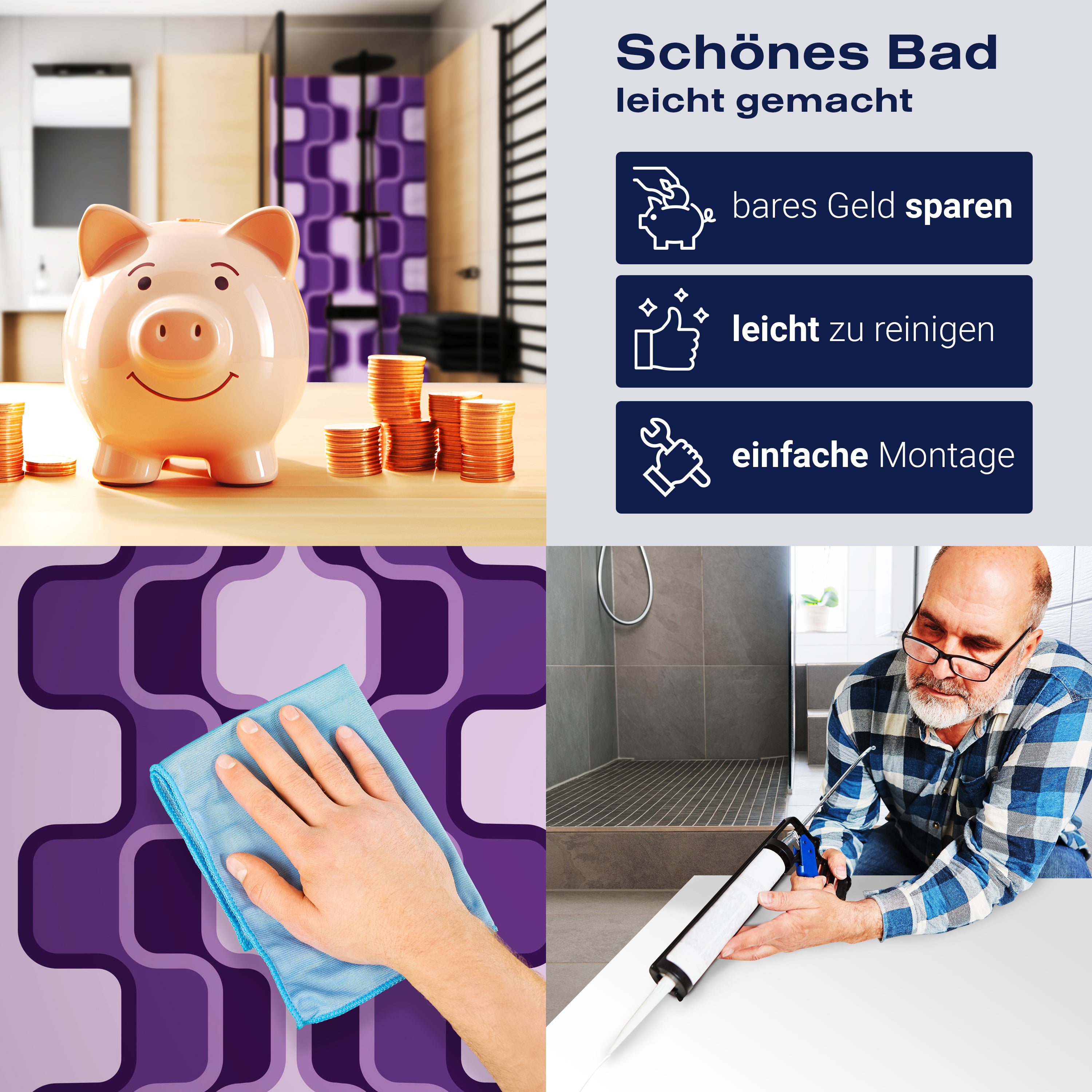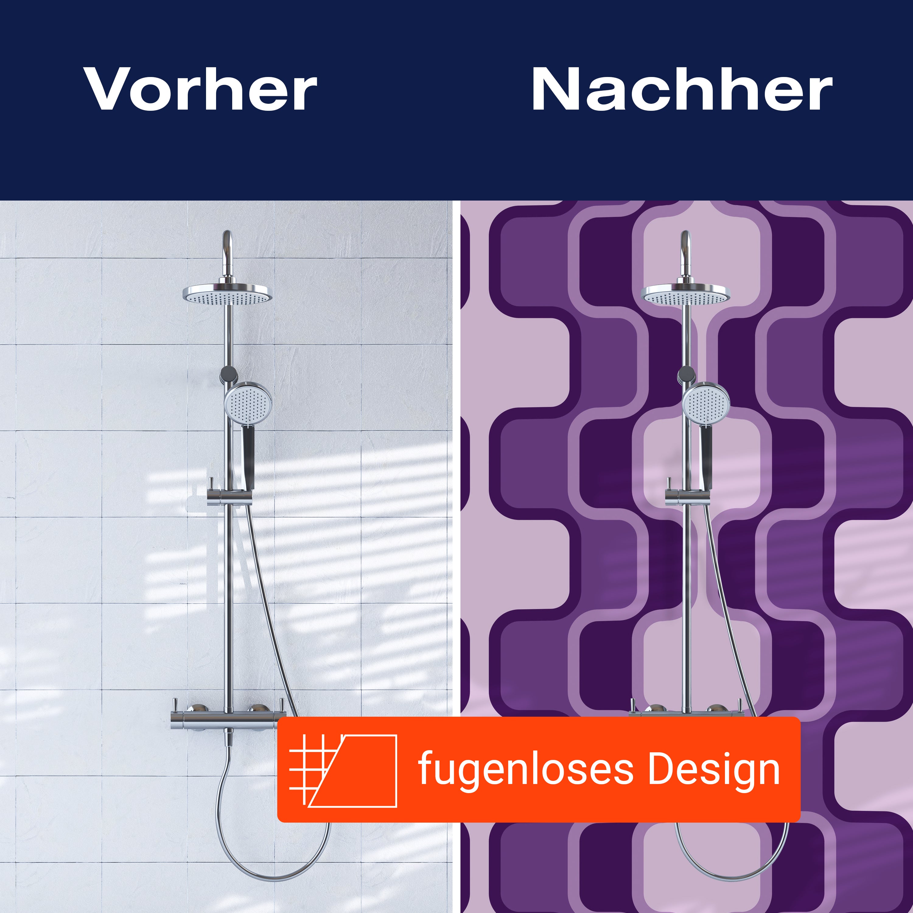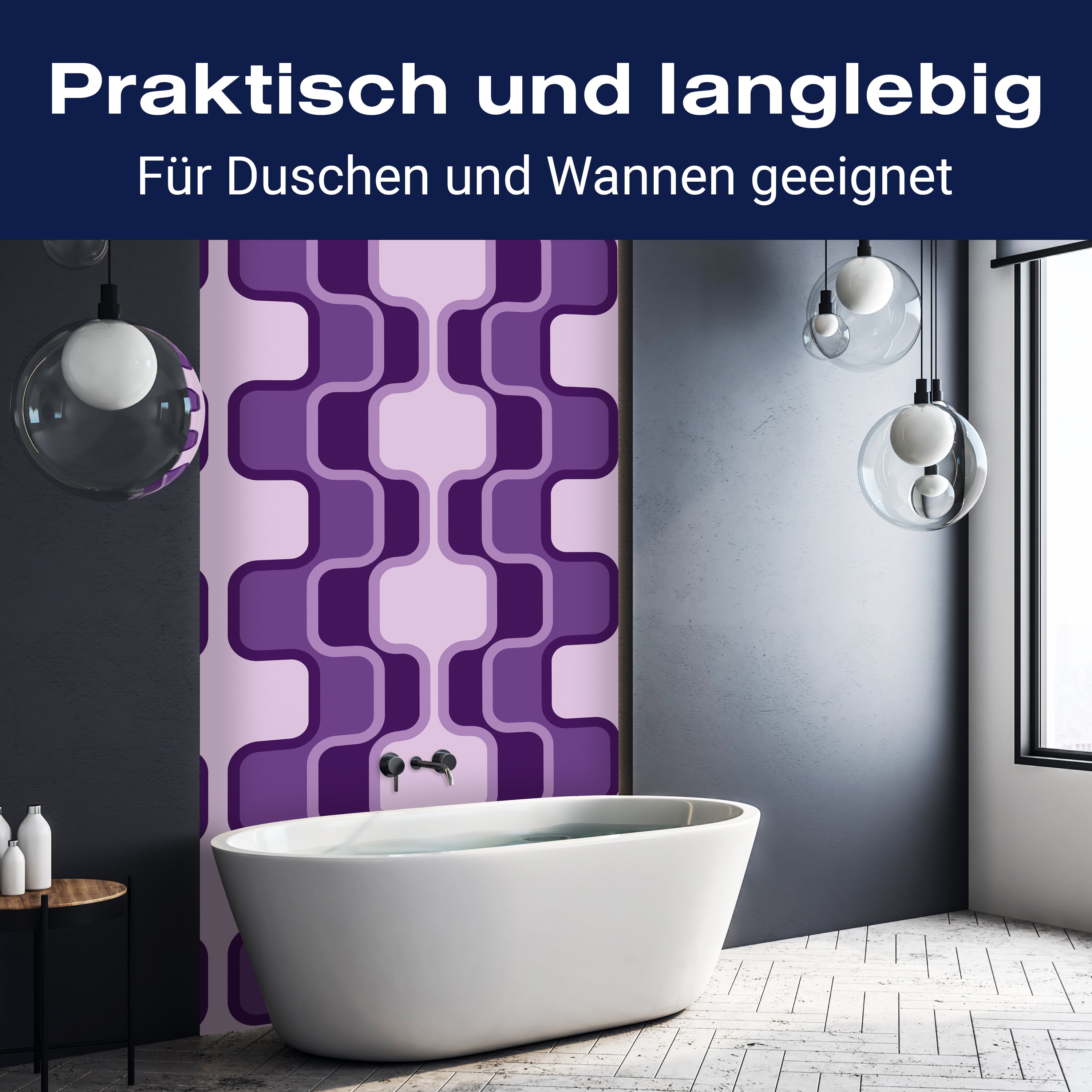 Bist du es leid, auf die langweiligen, schwer zu reinigende Fliesen in deiner Dusche zu schauen? Stell dir vor, wie dein Bad mit einer stilvollen, modernen Rückwand zum Leben erwacht! Unsere Duschwand 'Retromuster Violett Muster' ist nicht nur ein optisches Highlight, sondern auch praktisch und pflegeleicht.