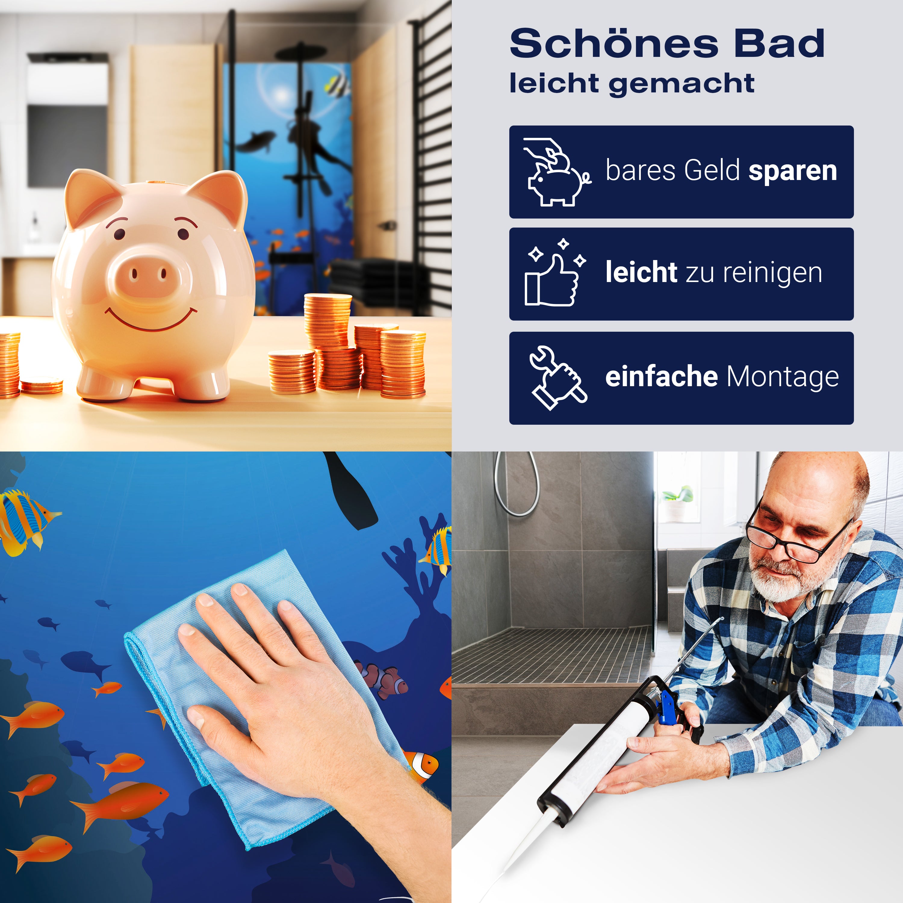 Bist du es leid, auf die langweiligen, schwer zu reinigende Fliesen in deiner Dusche zu schauen? Stell dir vor, wie dein Bad mit einer stilvollen, modernen Rückwand zum Leben erwacht! Unsere Duschwand 'Riff Meer' ist nicht nur ein optisches Highlight, sondern auch praktisch und pflegeleicht.