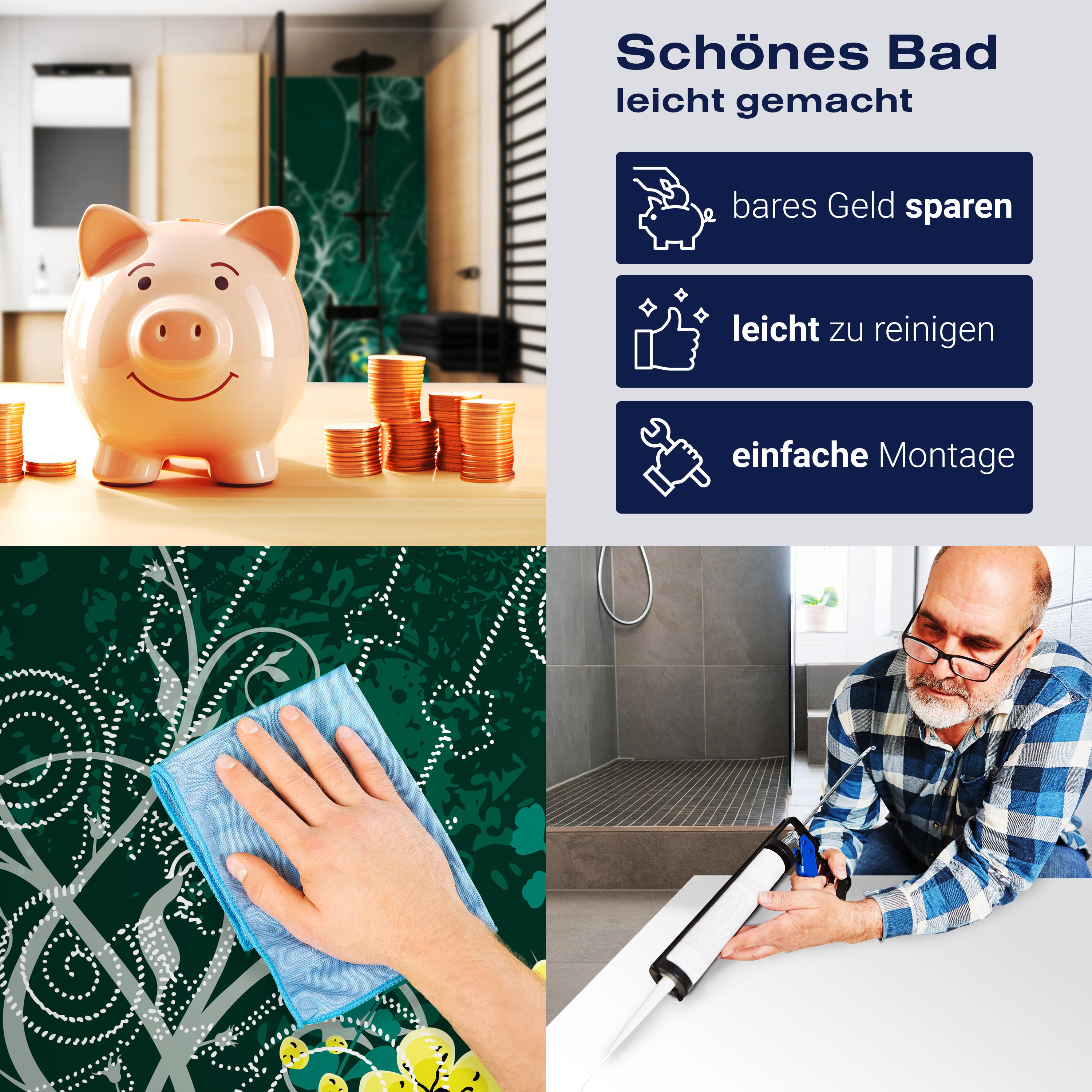 Die Reinigung Deiner Duschwand war noch nie so einfach. In einer Welt, in der Zeit ein kostbares Gut ist, verstehen wir, wie wichtig es ist, Reinigungsprozesse so effizient und mühelos wie möglich zu gestalten. Unsere Duschwände sind speziell dafür entworfen, Dein Leben leichter zu machen. Dank der glatten Oberfläche und der widerstandsfähigen Beschichtung lassen sich Spritzer und Flecken ohne großen Aufwand entfernen – ein schneller Wisch mit einem handelsüblichen Lappen, Spül- oder Wischtuch, und Deine Rückwand sieht aus wie neu.