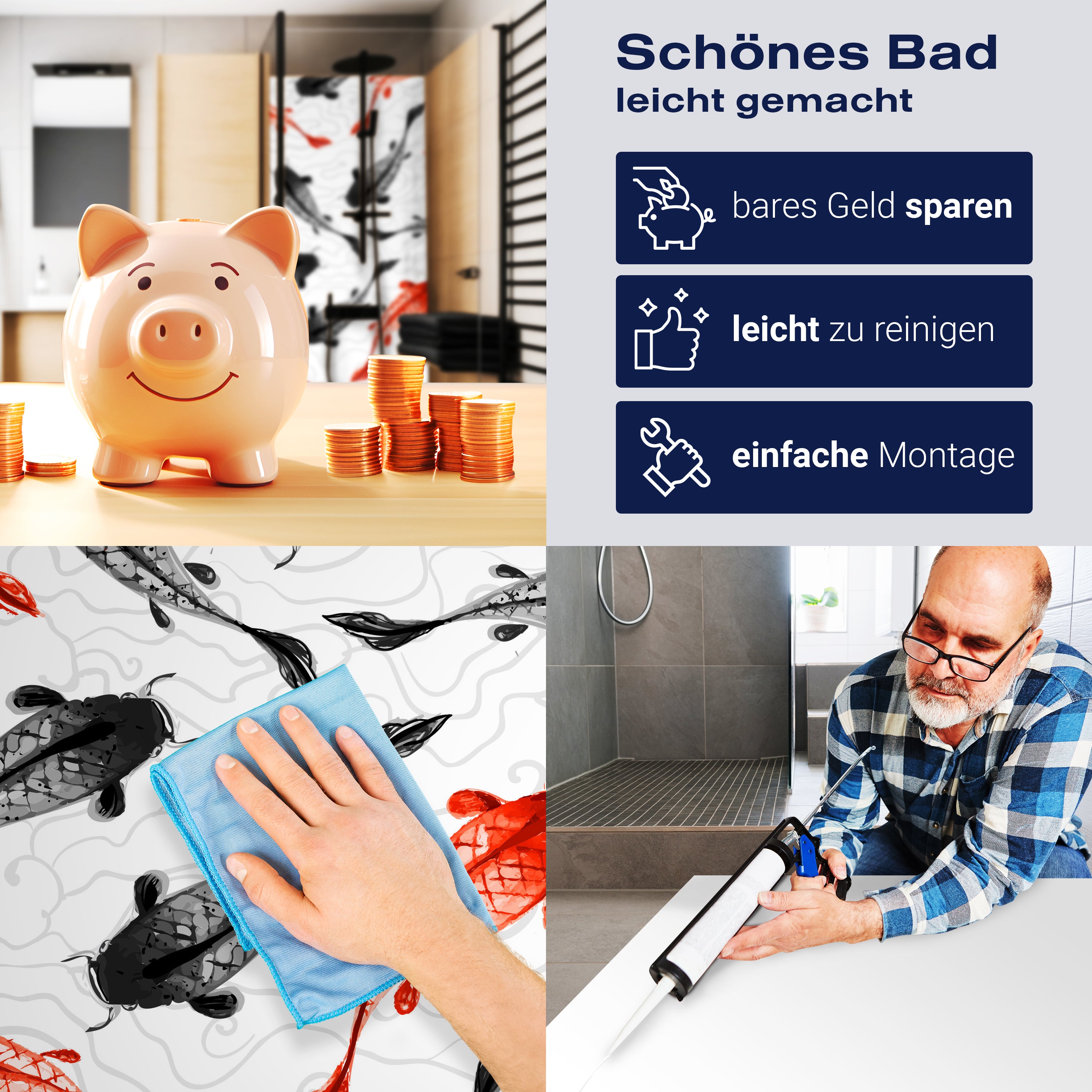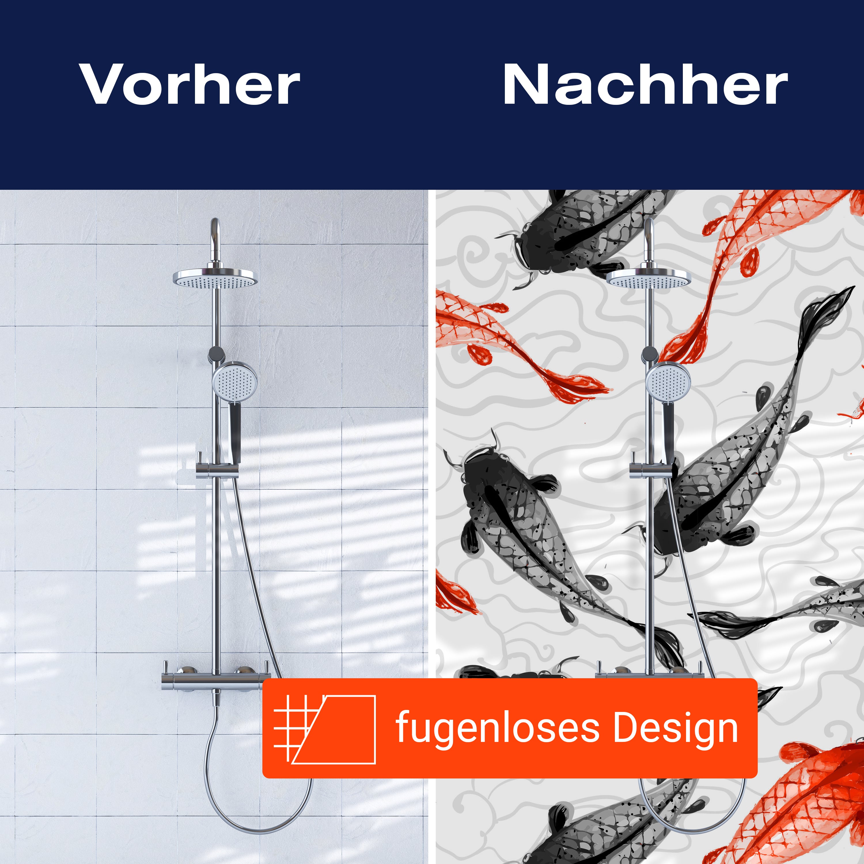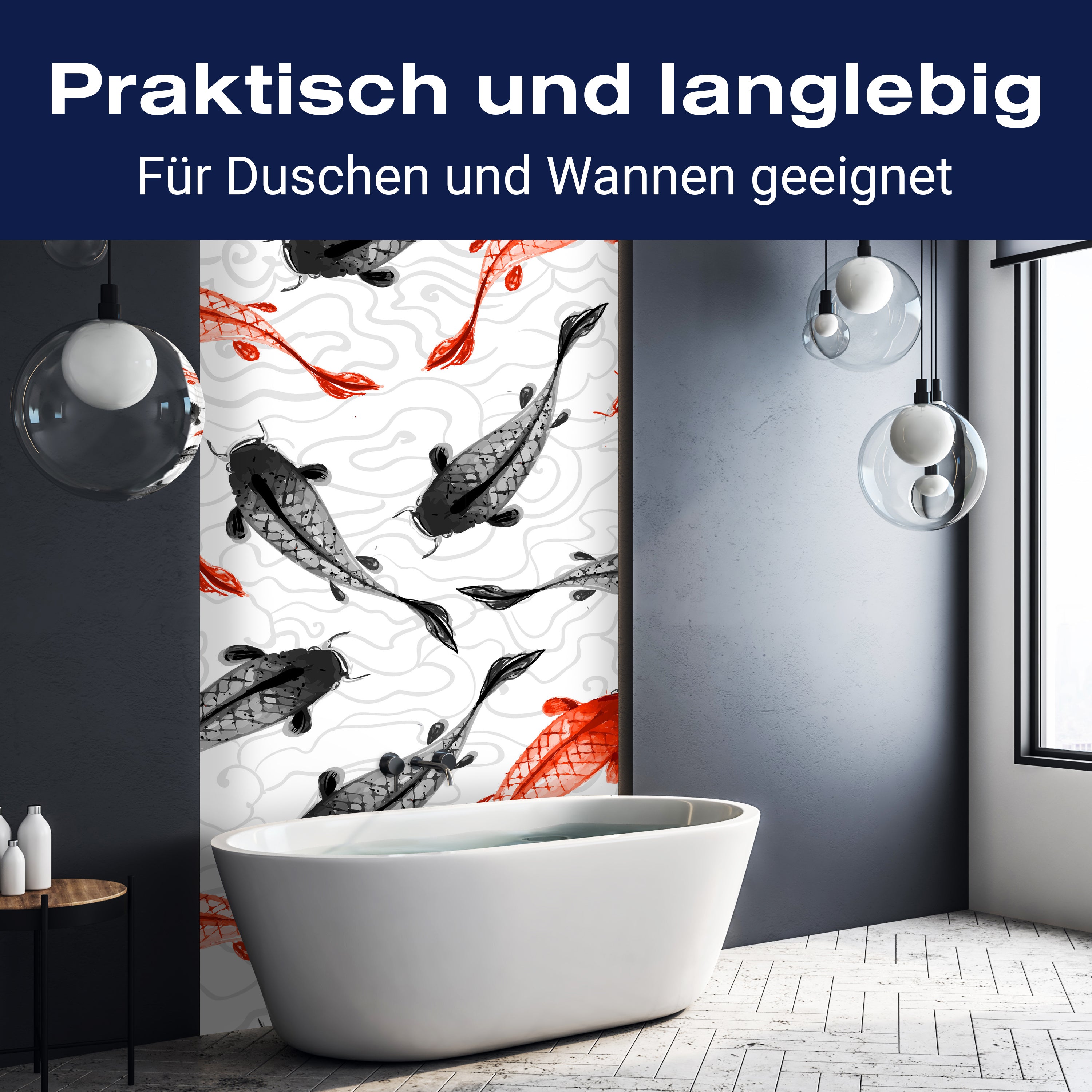 Bist du es leid, auf die langweiligen, schwer zu reinigende Fliesen in deiner Dusche zu schauen? Stell dir vor, wie dein Bad mit einer stilvollen, modernen Rückwand zum Leben erwacht! Unsere Duschwand 'rote und schwarze Koi-Karpfen' ist nicht nur ein optisches Highlight, sondern auch praktisch und pflegeleicht.