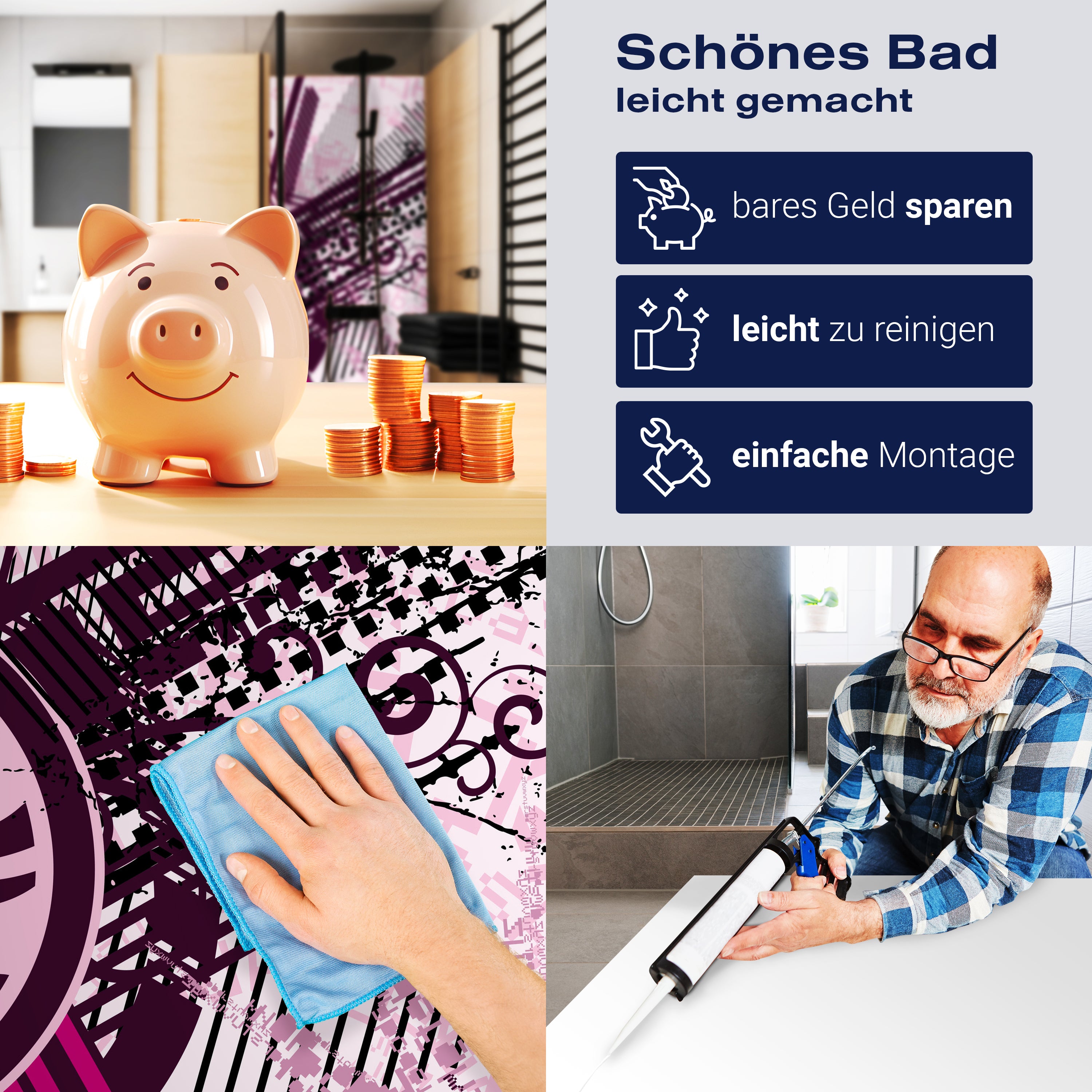 Die Reinigung Deiner Duschwand war noch nie so einfach. In einer Welt, in der Zeit ein kostbares Gut ist, verstehen wir, wie wichtig es ist, Reinigungsprozesse so effizient und mühelos wie möglich zu gestalten. Unsere Duschwände sind speziell dafür entworfen, Dein Leben leichter zu machen. Dank der glatten Oberfläche und der widerstandsfähigen Beschichtung lassen sich Spritzer und Flecken ohne großen Aufwand entfernen – ein schneller Wisch mit einem handelsüblichen Lappen, Spül- oder Wischtuch, und Deine Rückwand sieht aus wie neu.