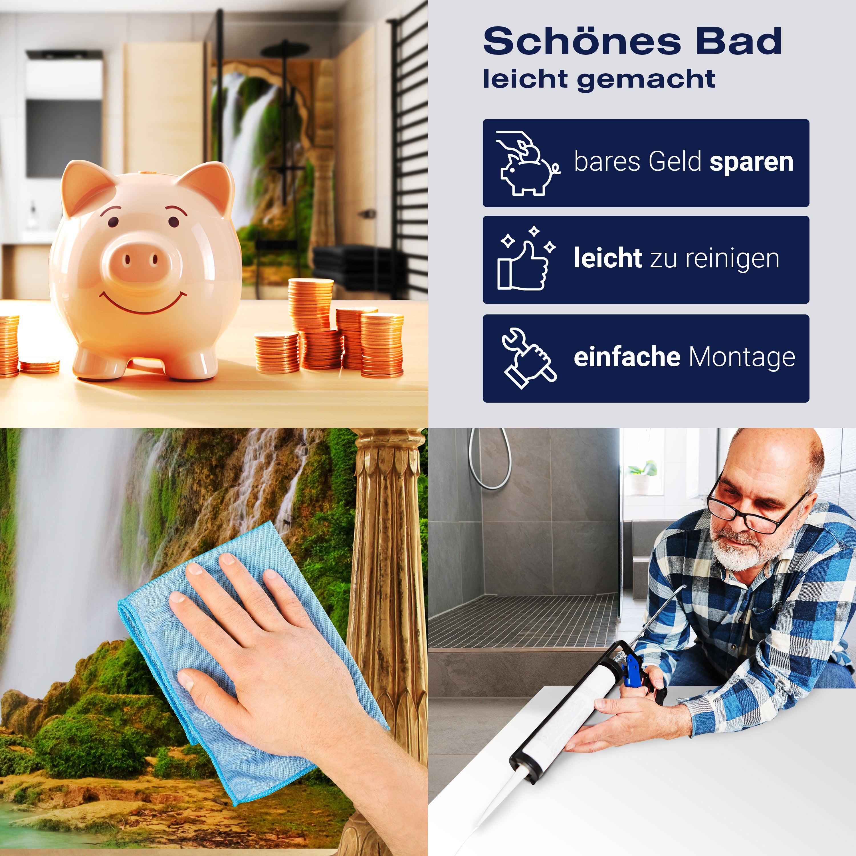 Bist du es leid, auf die langweiligen, schwer zu reinigende Fliesen in deiner Dusche zu schauen? Stell dir vor, wie dein Bad mit einer stilvollen, modernen Rückwand zum Leben erwacht! Unsere Duschwand 'Säulen - tropischer Wasserfall' ist nicht nur ein optisches Highlight, sondern auch praktisch und pflegeleicht.