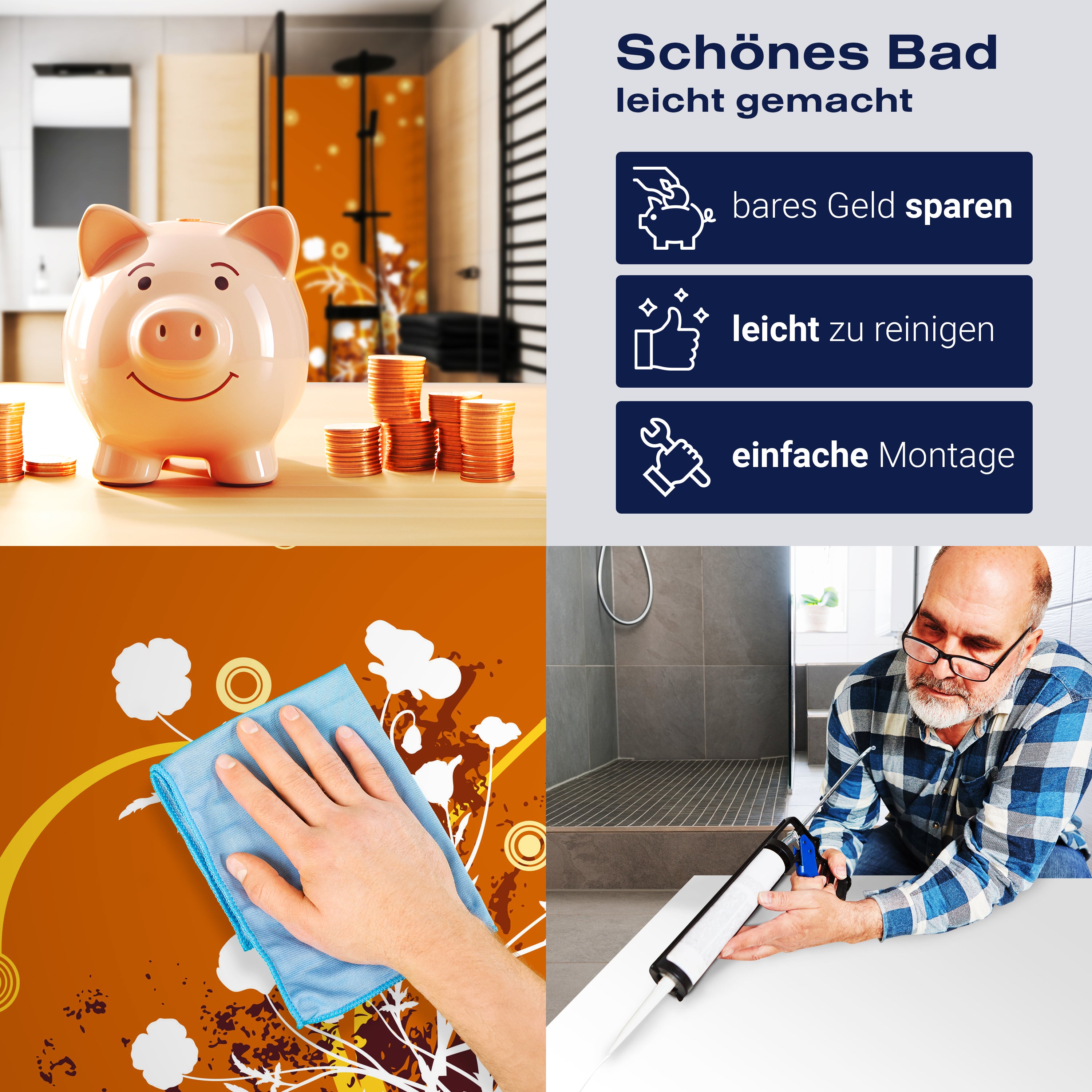 Die Reinigung Deiner Duschwand war noch nie so einfach. In einer Welt, in der Zeit ein kostbares Gut ist, verstehen wir, wie wichtig es ist, Reinigungsprozesse so effizient und mühelos wie möglich zu gestalten. Unsere Duschwände sind speziell dafür entworfen, Dein Leben leichter zu machen. Dank der glatten Oberfläche und der widerstandsfähigen Beschichtung lassen sich Spritzer und Flecken ohne großen Aufwand entfernen – ein schneller Wisch mit einem handelsüblichen Lappen, Spül- oder Wischtuch, und Deine Rückwand sieht aus wie neu.