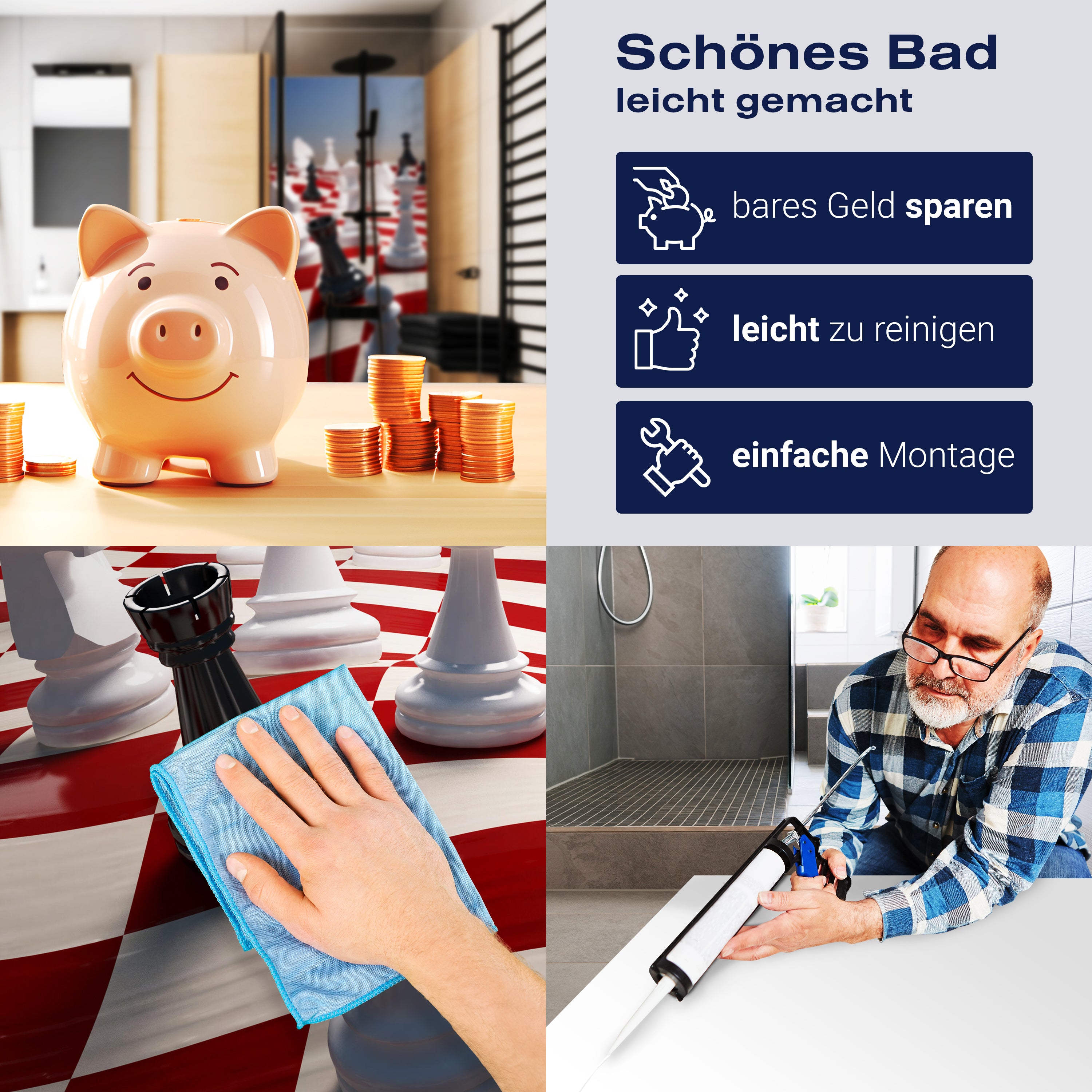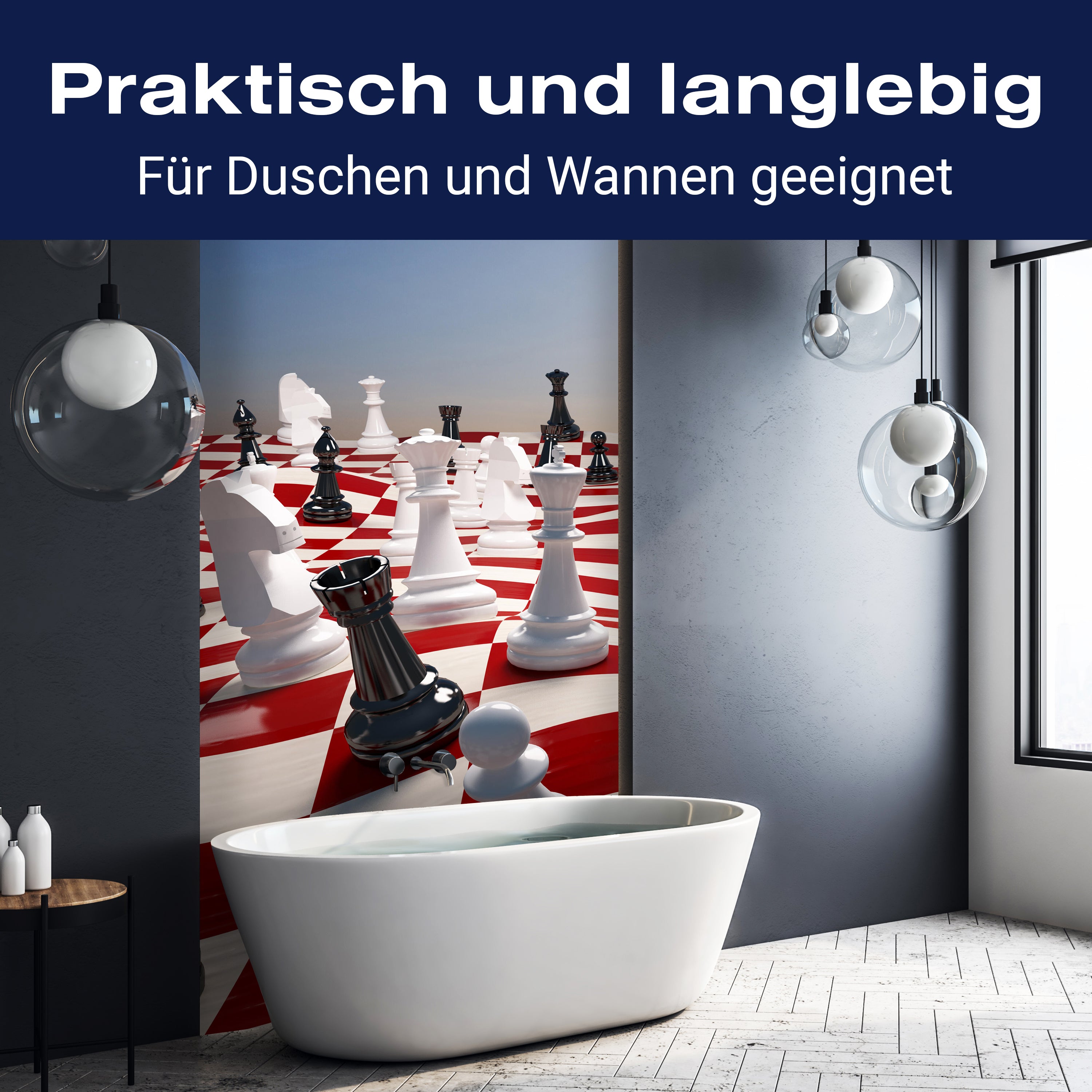 Vergiss die Tage, an denen Spritzer und Flecken deine Dusche ruiniert haben. Mit der Duschrückwand 'Schach auf einem winkenden Schachfeld' gehören solche Sorgen der Vergangenheit an. Das hochwertige Material sorgt dafür, dass deine Dusche gegen Wasser und andere alltägliche Missgeschicke resistent ist. Ein einfacher Wisch, und sie sieht aus wie neu – ohne den Einsatz von aggressiven Reinigungsmitteln.