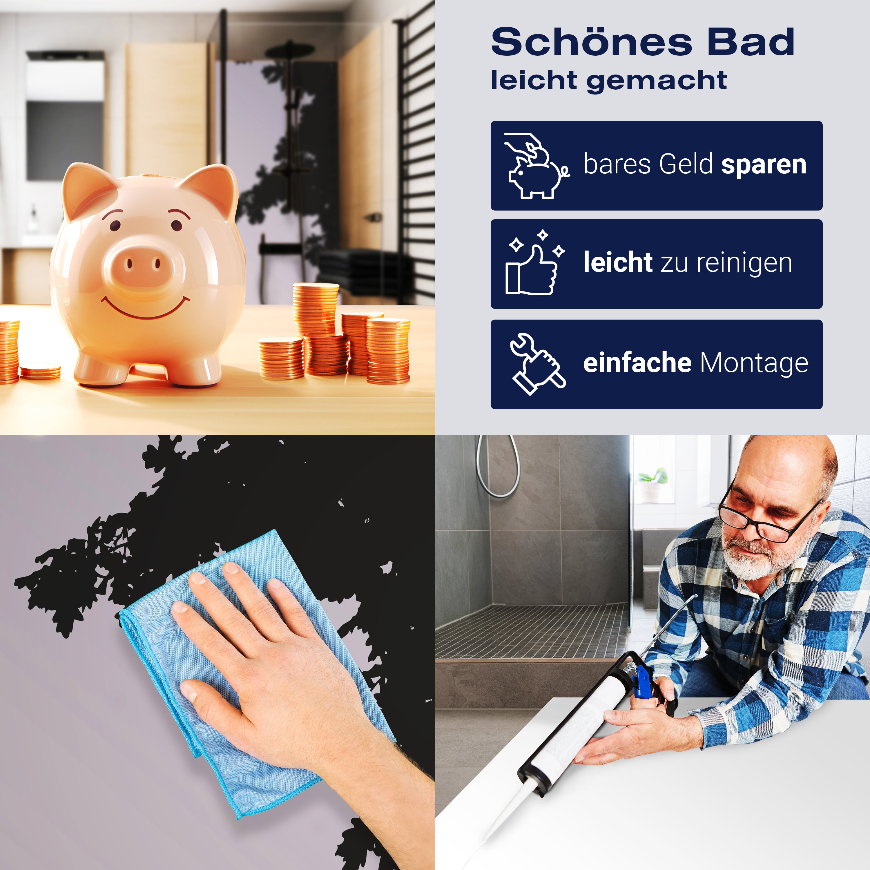 Die Reinigung Deiner Duschwand war noch nie so einfach. In einer Welt, in der Zeit ein kostbares Gut ist, verstehen wir, wie wichtig es ist, Reinigungsprozesse so effizient und mühelos wie möglich zu gestalten. Unsere Duschwände sind speziell dafür entworfen, Dein Leben leichter zu machen. Dank der glatten Oberfläche und der widerstandsfähigen Beschichtung lassen sich Spritzer und Flecken ohne großen Aufwand entfernen – ein schneller Wisch mit einem handelsüblichen Lappen, Spül- oder Wischtuch, und Deine Rückwand sieht aus wie neu.