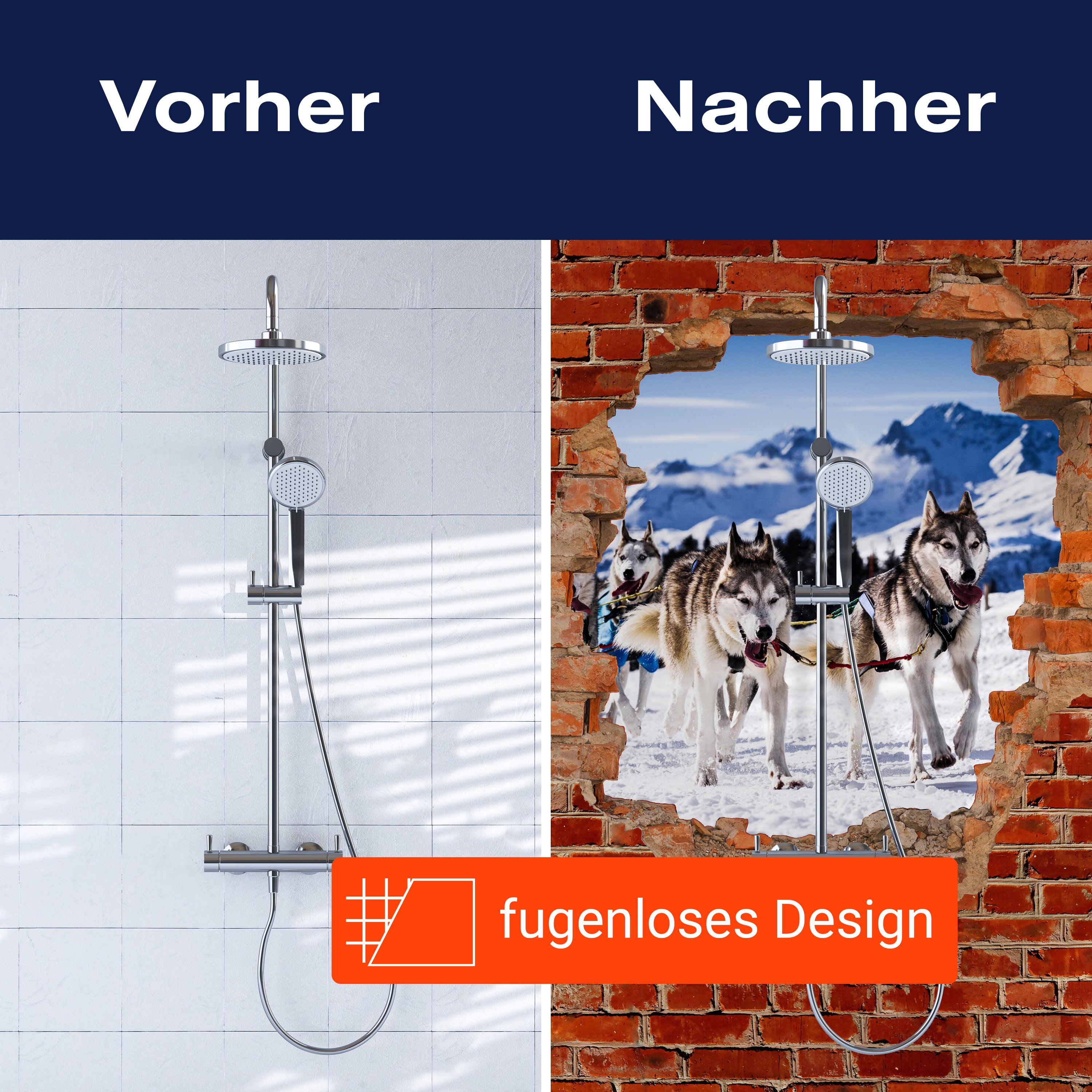Bist du es leid, auf die langweiligen, schwer zu reinigende Fliesen in deiner Dusche zu schauen? Stell dir vor, wie dein Bad mit einer stilvollen, modernen Rückwand zum Leben erwacht! Unsere Duschwand 'Schlittenhunde in Racing - Roter Backstein' ist nicht nur ein optisches Highlight, sondern auch praktisch und pflegeleicht.