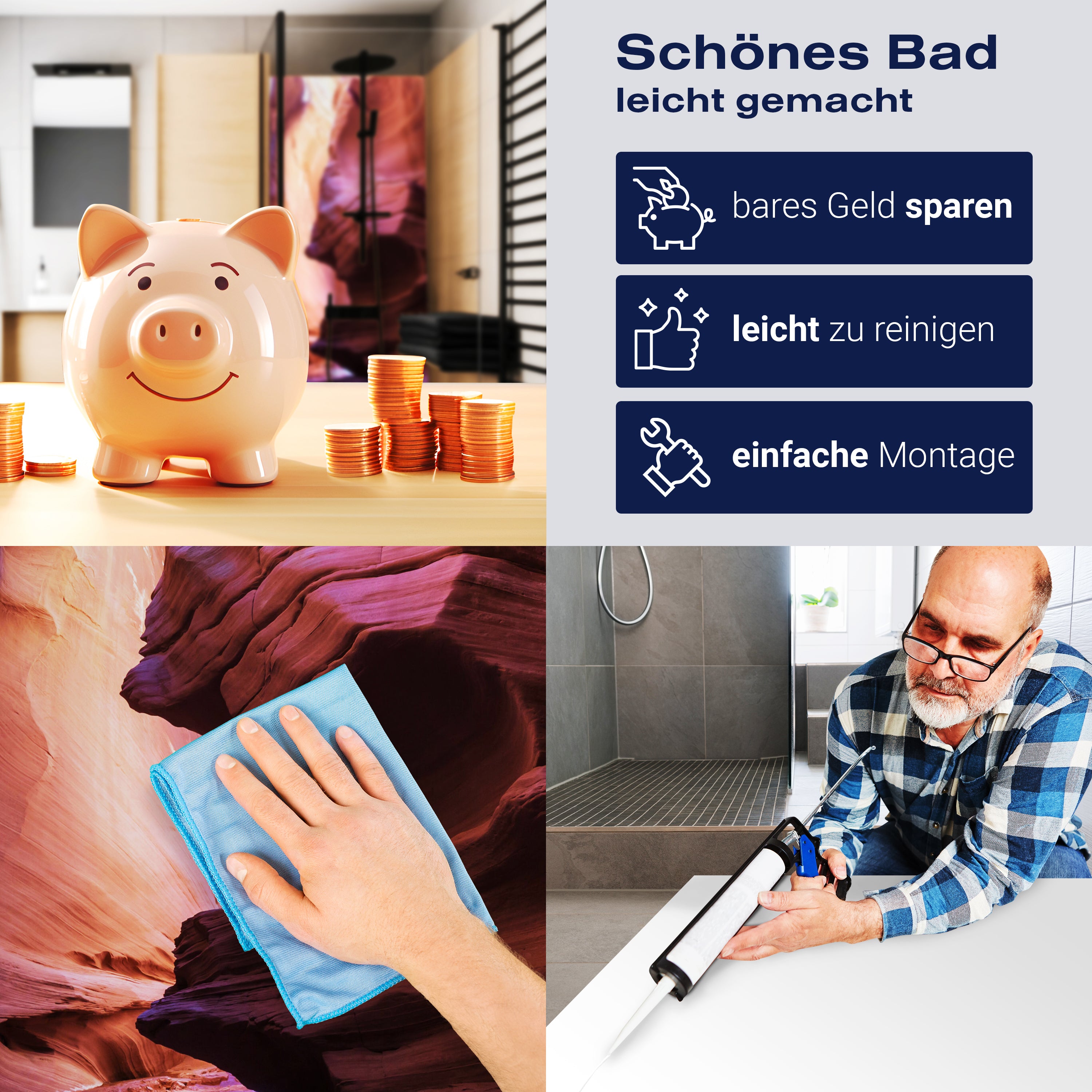 Die Reinigung Deiner Duschwand war noch nie so einfach. In einer Welt, in der Zeit ein kostbares Gut ist, verstehen wir, wie wichtig es ist, Reinigungsprozesse so effizient und mühelos wie möglich zu gestalten. Unsere Duschwände sind speziell dafür entworfen, Dein Leben leichter zu machen. Dank der glatten Oberfläche und der widerstandsfähigen Beschichtung lassen sich Spritzer und Flecken ohne großen Aufwand entfernen – ein schneller Wisch mit einem handelsüblichen Lappen, Spül- oder Wischtuch, und Deine Rückwand sieht aus wie neu.