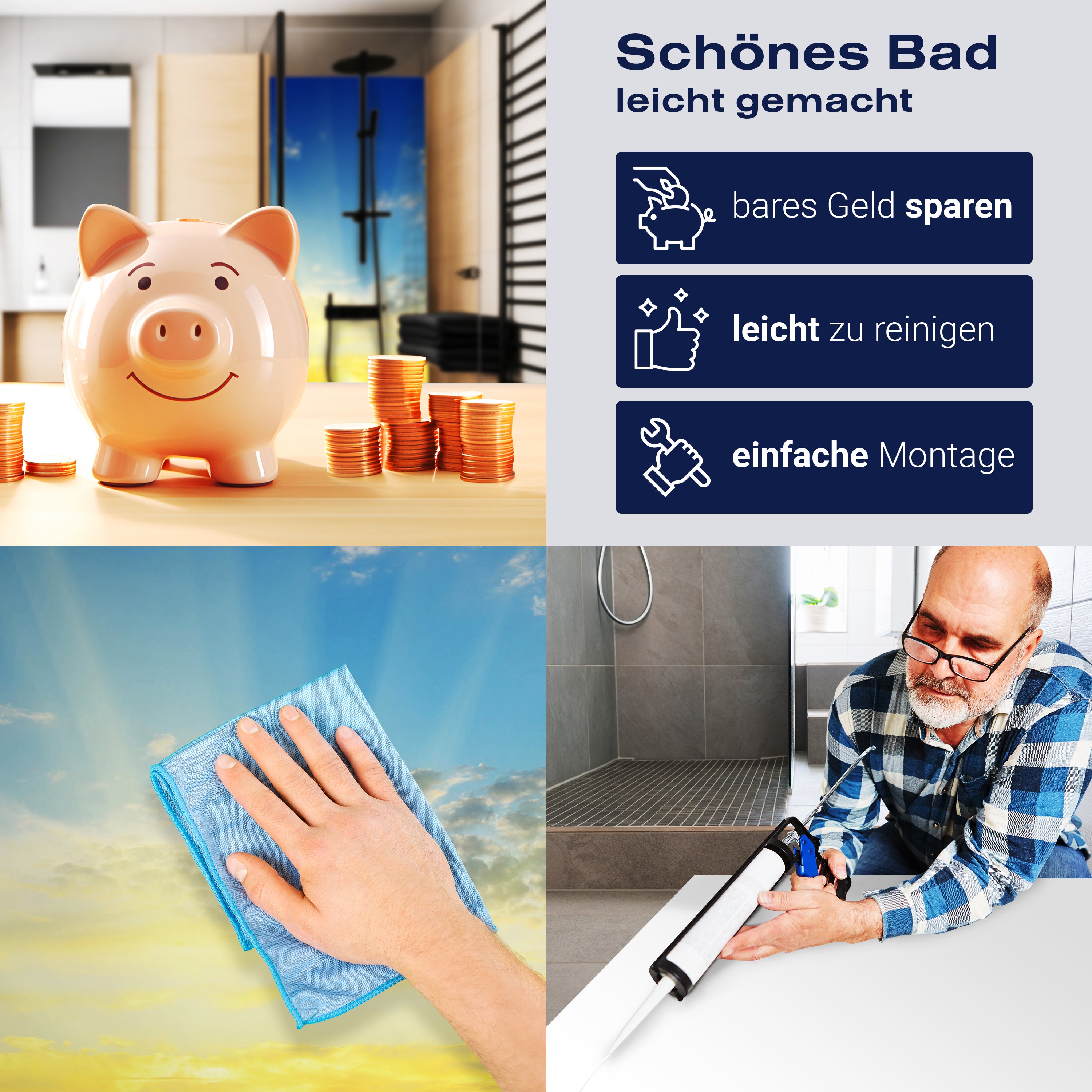 Die Reinigung Deiner Duschwand war noch nie so einfach. In einer Welt, in der Zeit ein kostbares Gut ist, verstehen wir, wie wichtig es ist, Reinigungsprozesse so effizient und mühelos wie möglich zu gestalten. Unsere Duschwände sind speziell dafür entworfen, Dein Leben leichter zu machen. Dank der glatten Oberfläche und der widerstandsfähigen Beschichtung lassen sich Spritzer und Flecken ohne großen Aufwand entfernen – ein schneller Wisch mit einem handelsüblichen Lappen, Spül- oder Wischtuch, und Deine Rückwand sieht aus wie neu.