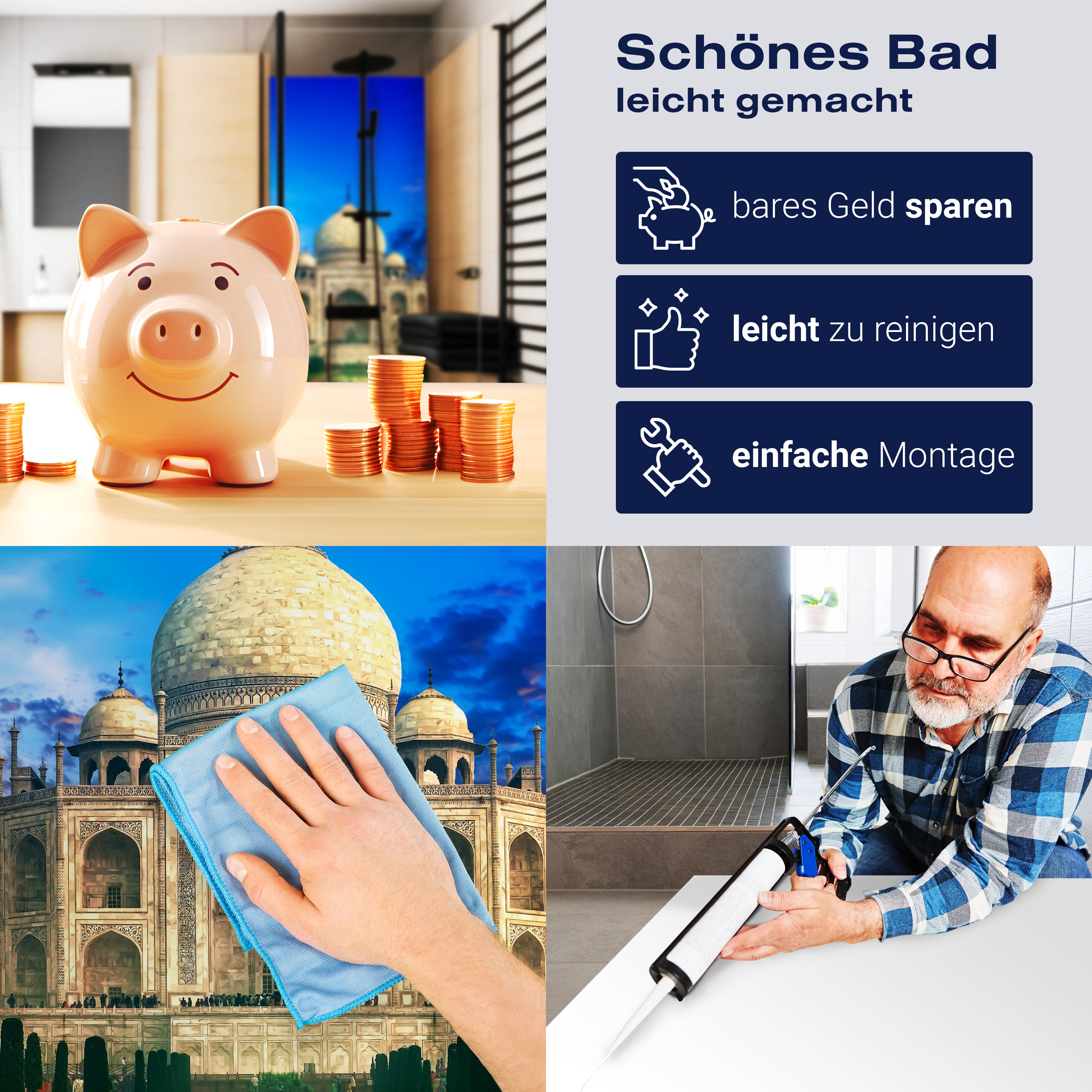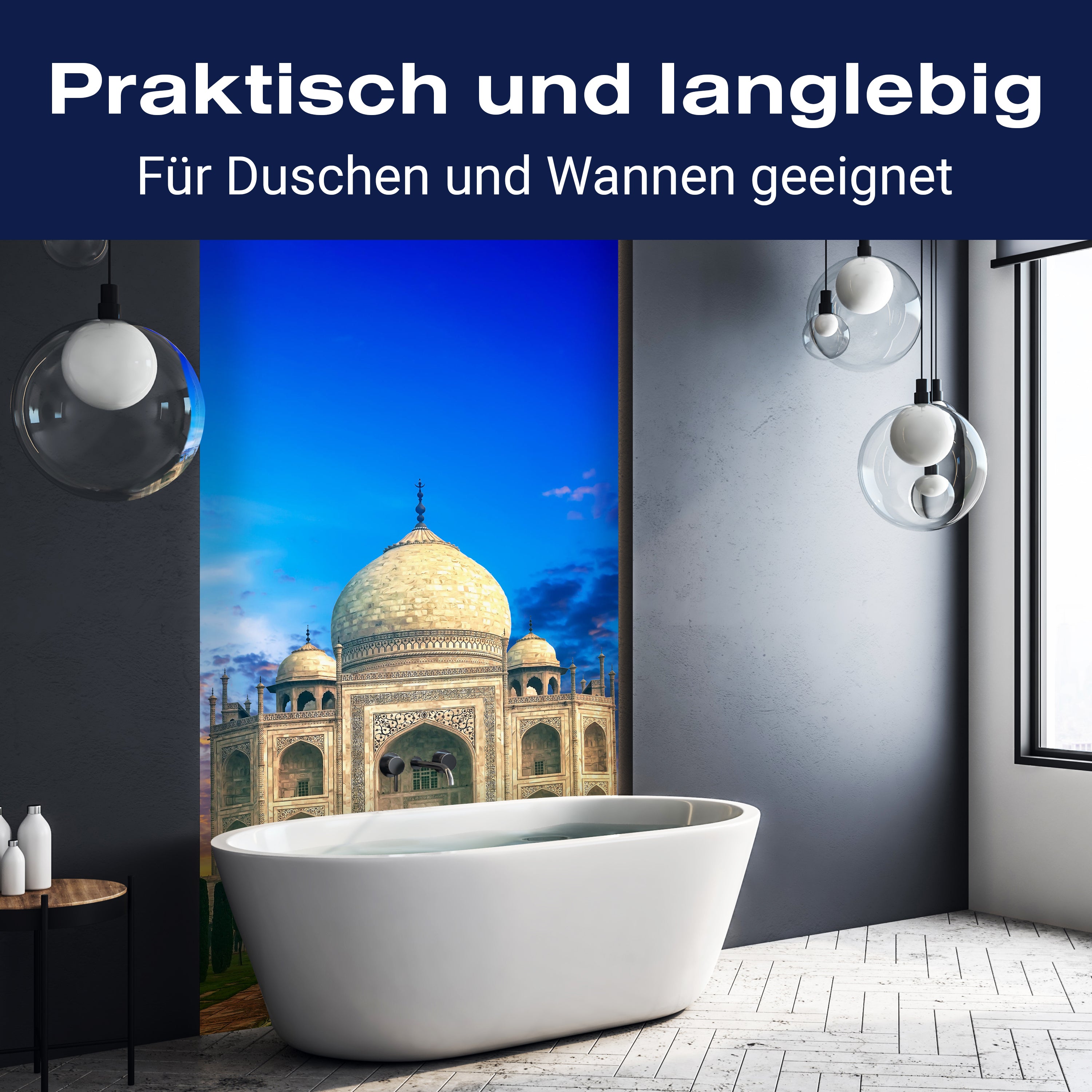 Bist du es leid, auf die langweiligen, schwer zu reinigende Fliesen in deiner Dusche zu schauen? Stell dir vor, wie dein Bad mit einer stilvollen, modernen Rückwand zum Leben erwacht! Unsere Duschwand 'Taj Mahal Indien Sonnenuntergang' ist nicht nur ein optisches Highlight, sondern auch praktisch und pflegeleicht.