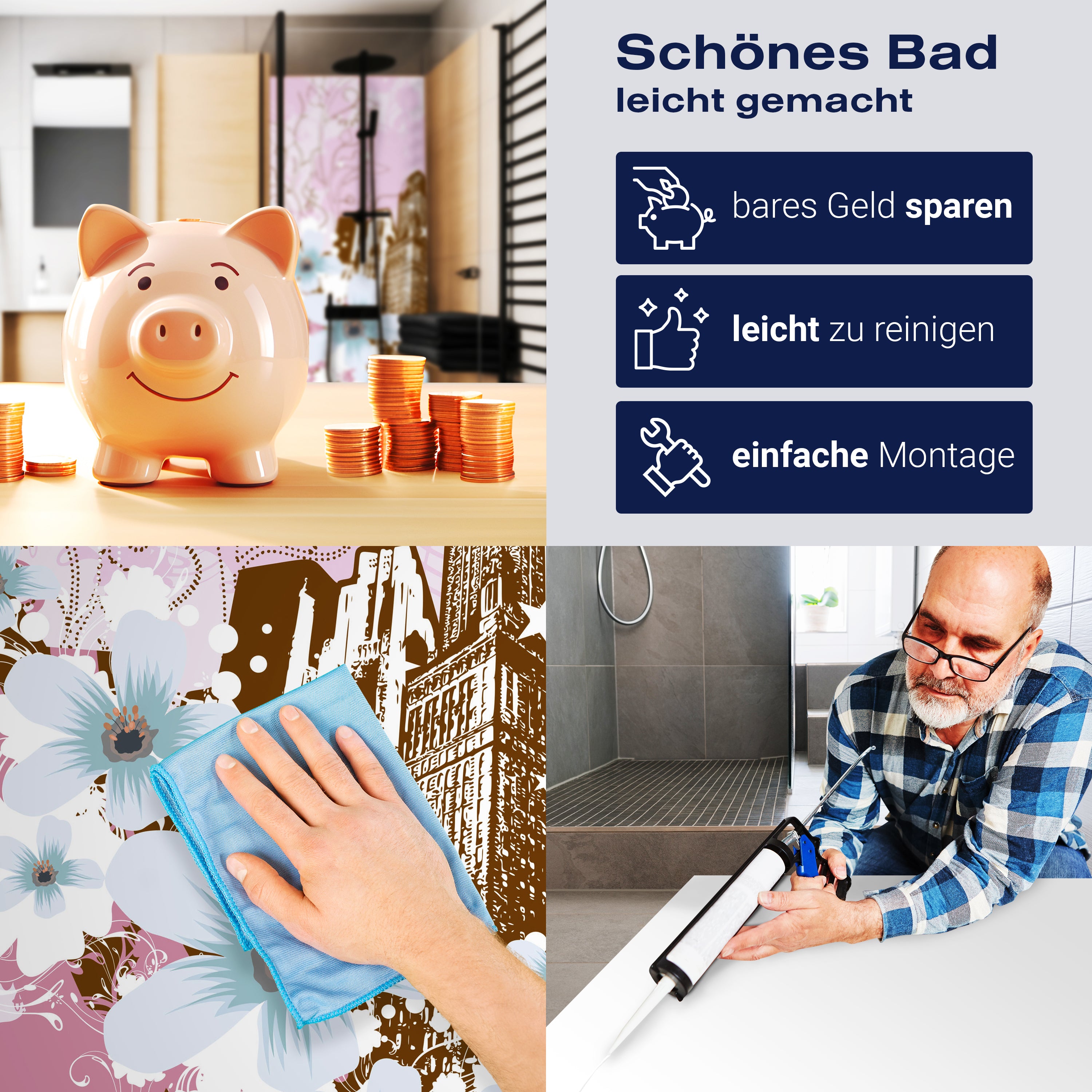 Bist du es leid, auf die langweiligen, schwer zu reinigende Fliesen in deiner Dusche zu schauen? Stell dir vor, wie dein Bad mit einer stilvollen, modernen Rückwand zum Leben erwacht! Unsere Duschwand 'Urban Flower Grunge' ist nicht nur ein optisches Highlight, sondern auch praktisch und pflegeleicht.