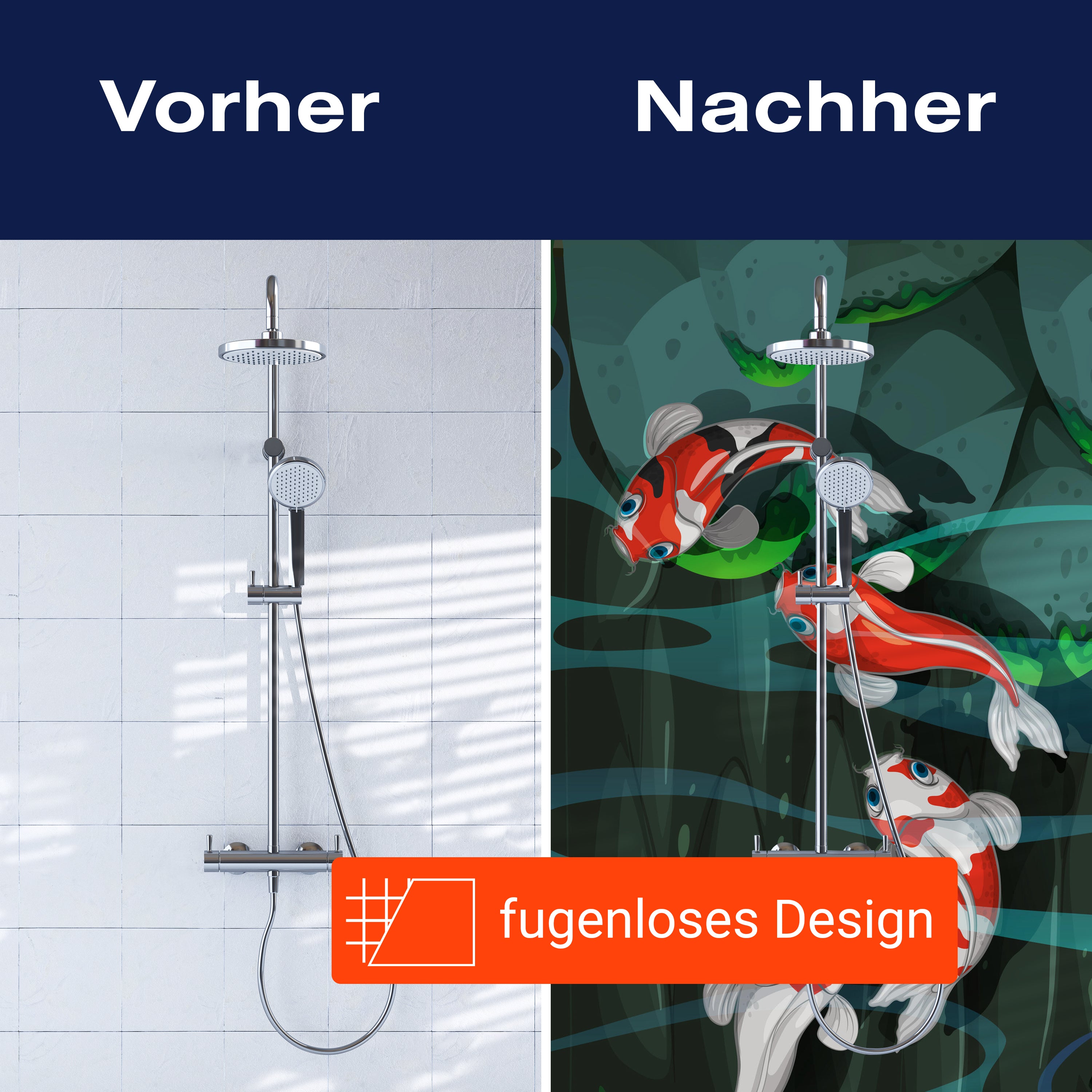 Bist du es leid, auf die langweiligen, schwer zu reinigende Fliesen in deiner Dusche zu schauen? Stell dir vor, wie dein Bad mit einer stilvollen, modernen Rückwand zum Leben erwacht! Unsere Duschwand 'Vier Fische schwimmen im Teich' ist nicht nur ein optisches Highlight, sondern auch praktisch und pflegeleicht.