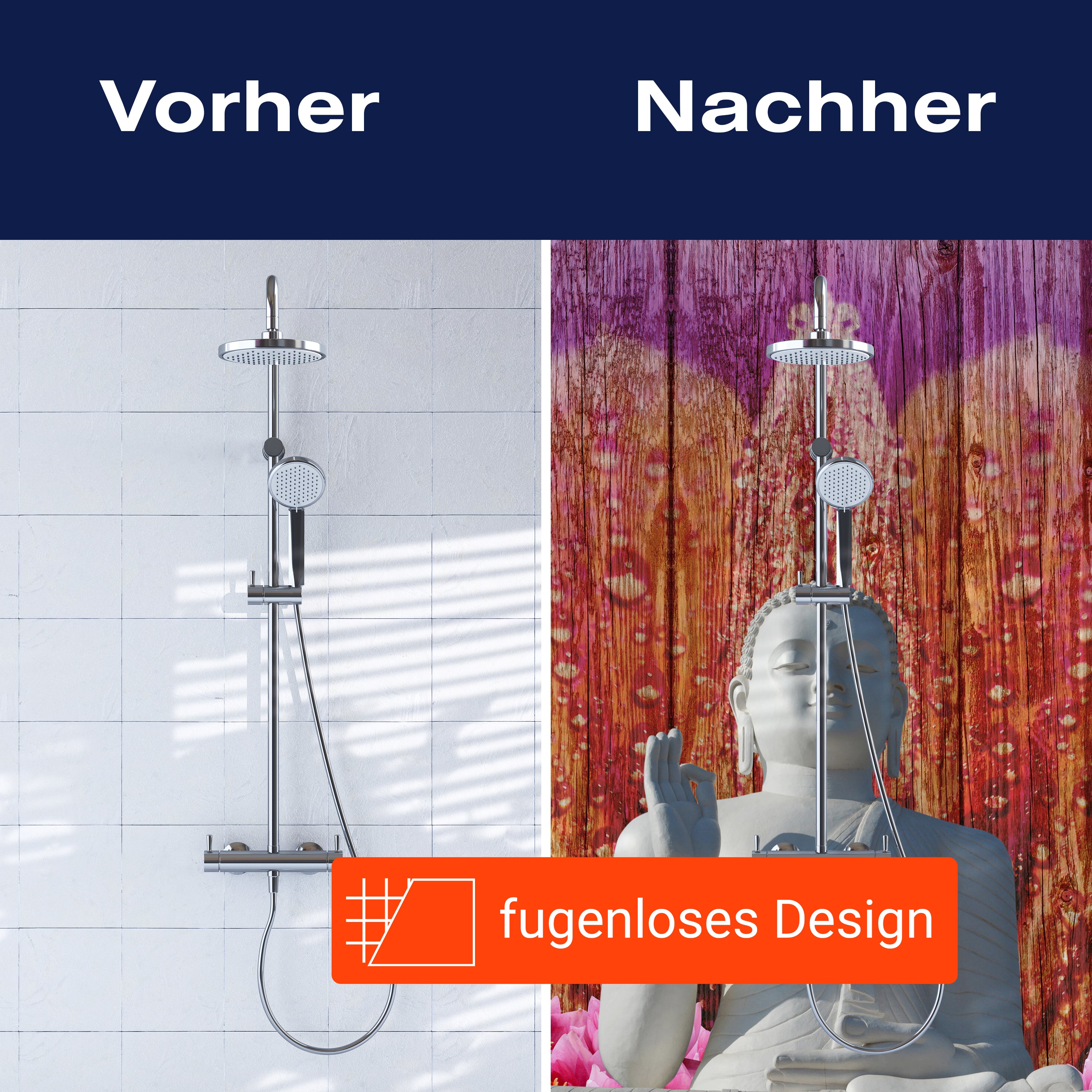 Vergiss die Tage, an denen Spritzer und Flecken deine Dusche ruiniert haben. Mit der Duschrückwand 'Weiß Sitzende Buddha-Statue' gehören solche Sorgen der Vergangenheit an. Das hochwertige Material sorgt dafür, dass deine Dusche gegen Wasser und andere alltägliche Missgeschicke resistent ist. Ein einfacher Wisch, und sie sieht aus wie neu – ohne den Einsatz von aggressiven Reinigungsmitteln.