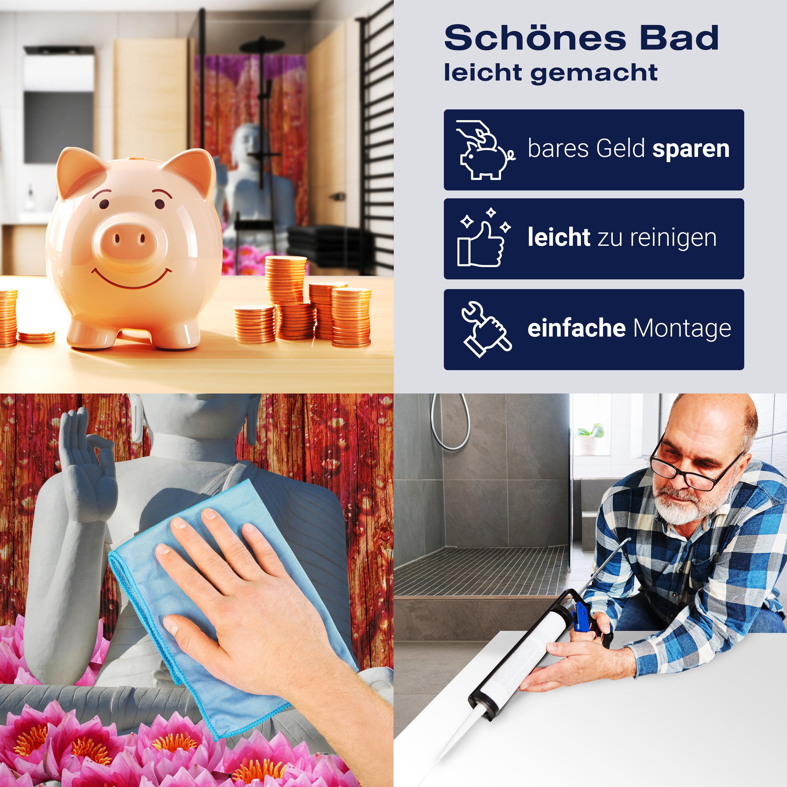 Bist du es leid, auf die langweiligen, schwer zu reinigende Fliesen in deiner Dusche zu schauen? Stell dir vor, wie dein Bad mit einer stilvollen, modernen Rückwand zum Leben erwacht! Unsere Duschwand 'Weiß Sitzende Buddha-Statue' ist nicht nur ein optisches Highlight, sondern auch praktisch und pflegeleicht.