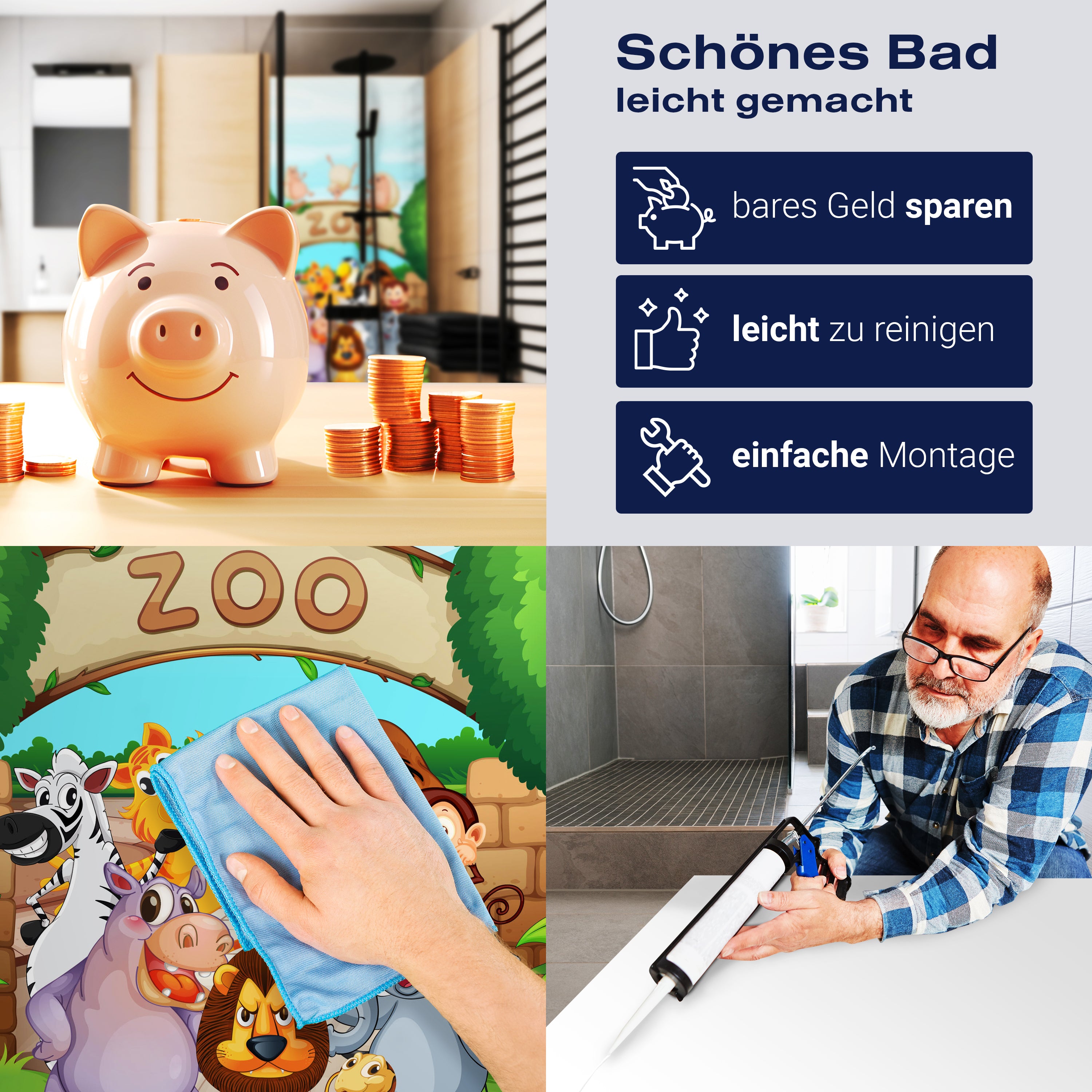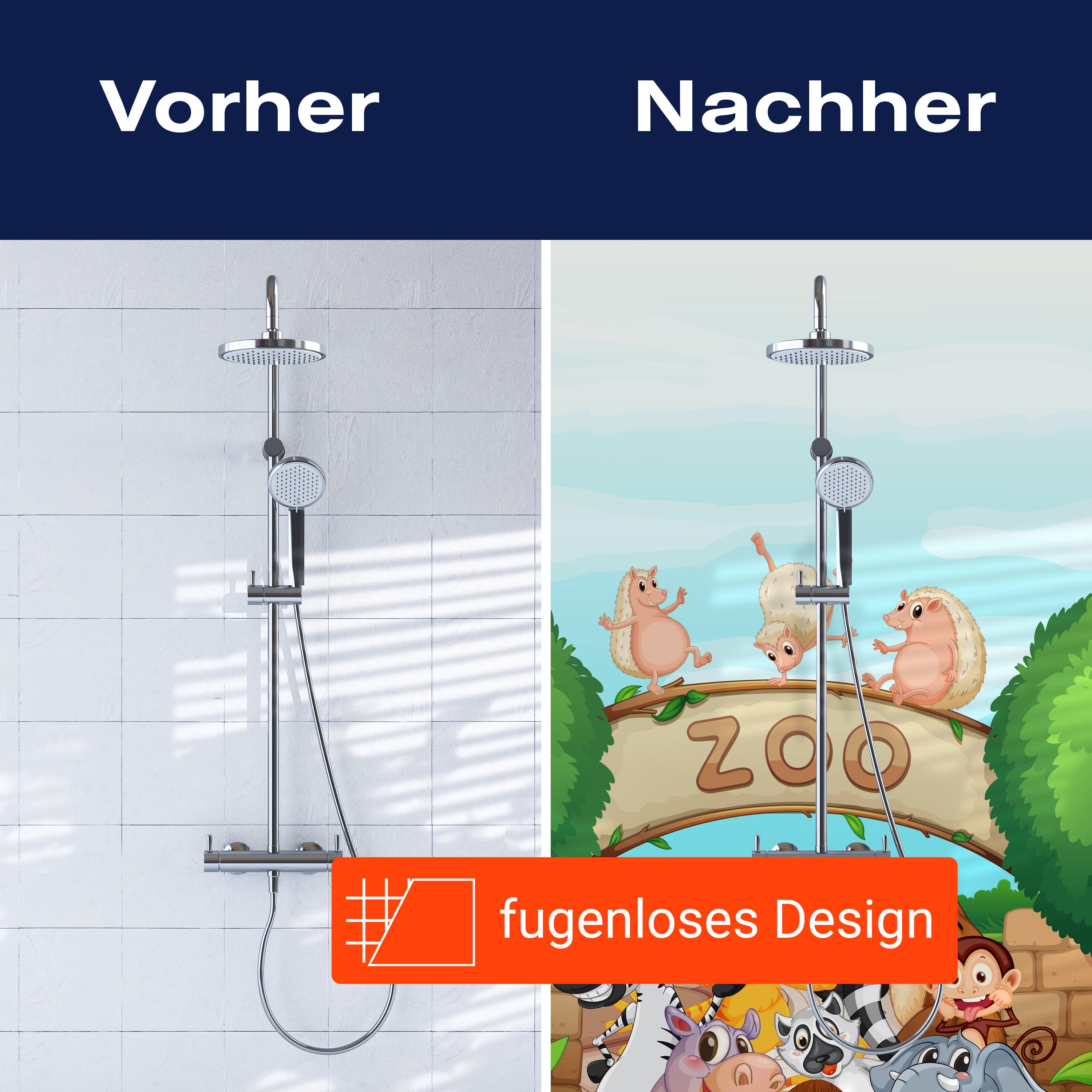 Bist du es leid, auf die langweiligen, schwer zu reinigende Fliesen in deiner Dusche zu schauen? Stell dir vor, wie dein Bad mit einer stilvollen, modernen Rückwand zum Leben erwacht! Unsere Duschwand 'Zootiere Kinder' ist nicht nur ein optisches Highlight, sondern auch praktisch und pflegeleicht.