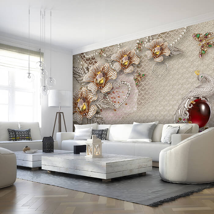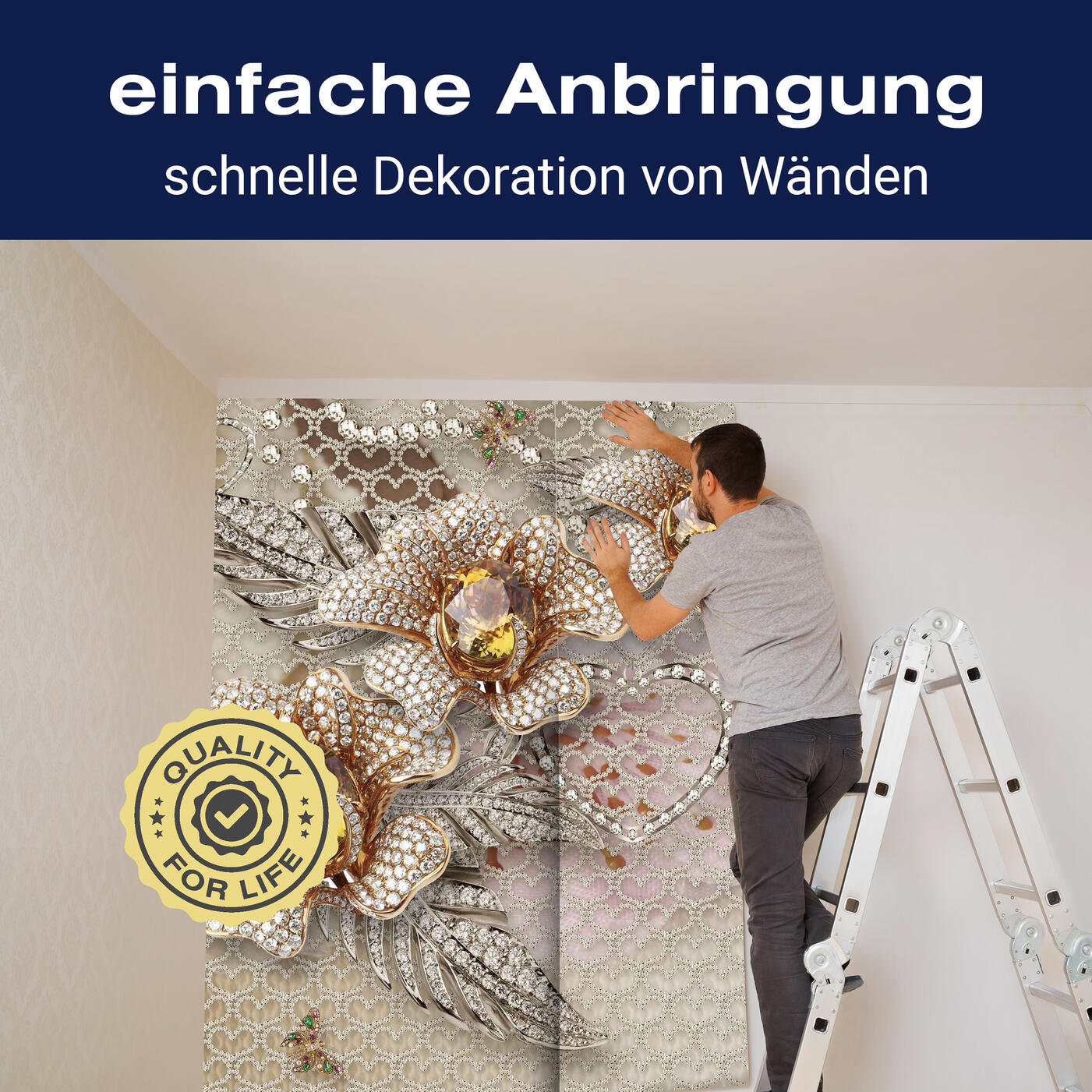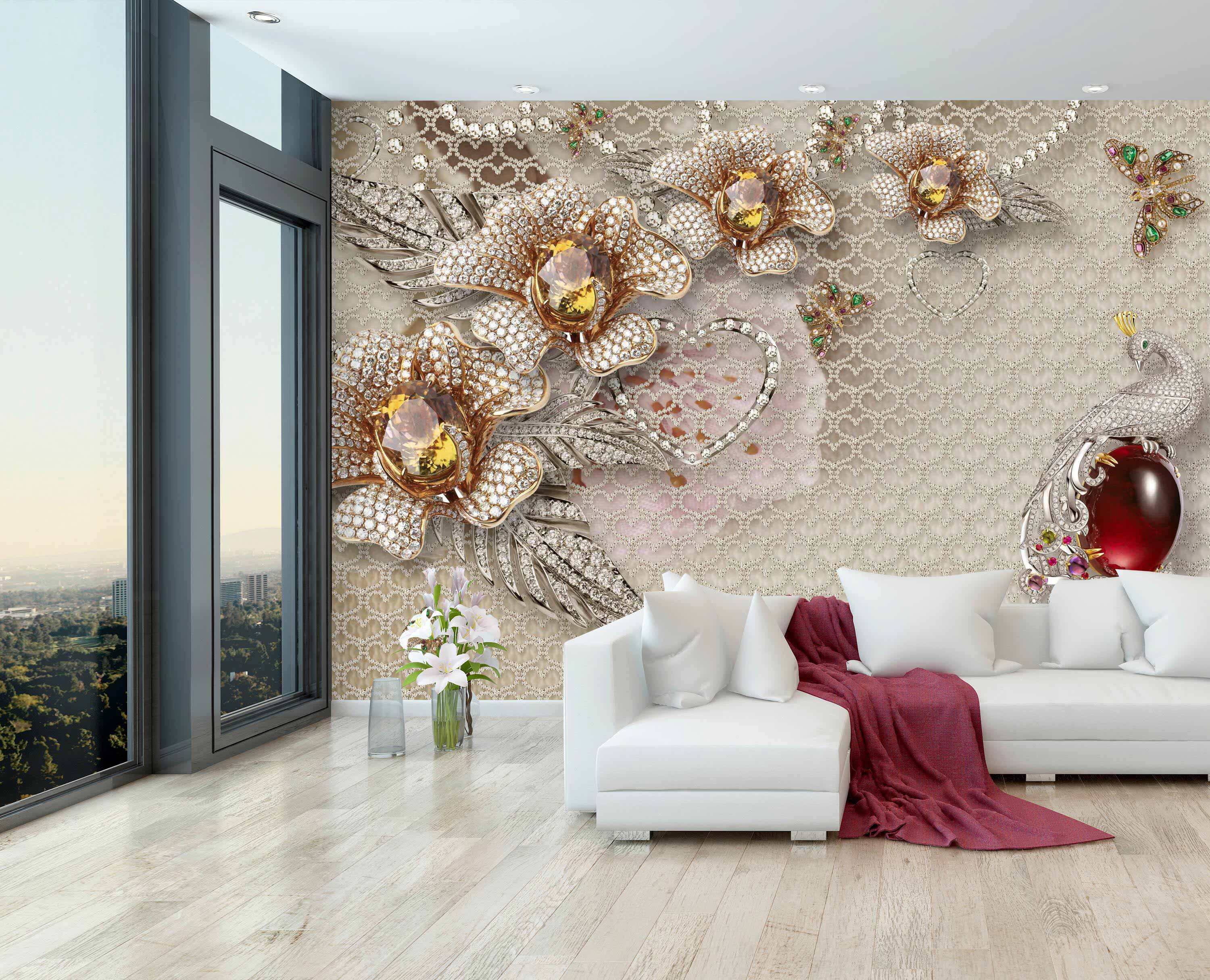 FOTOTAPETE 3D Blumen Diamanten Pfau Edelsteine