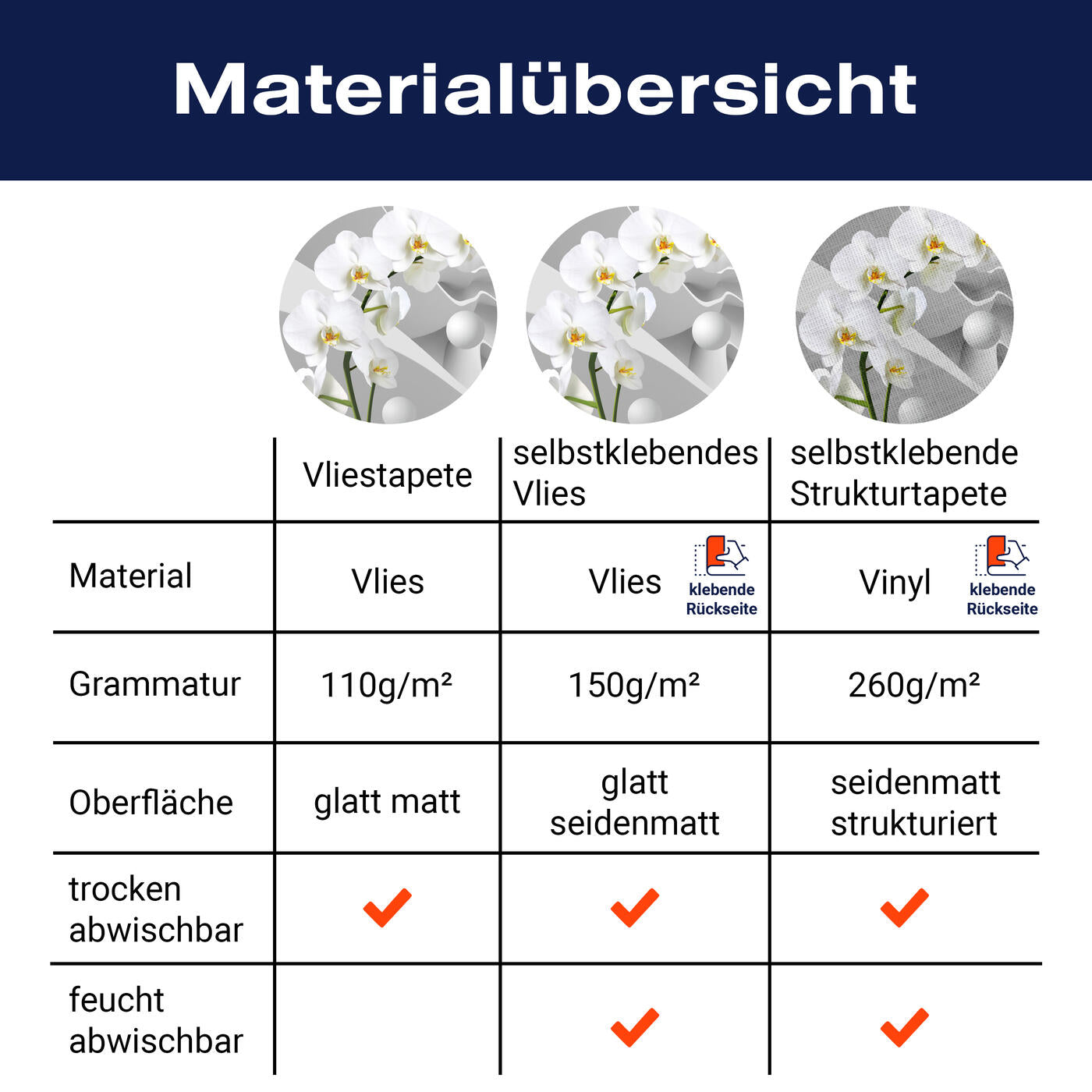 Die Fototapeten sind pflegeleicht und können mit einem feuchten Tuch gereinigt werden, ohne die Farbbrillanz zu beeinträchtigen.