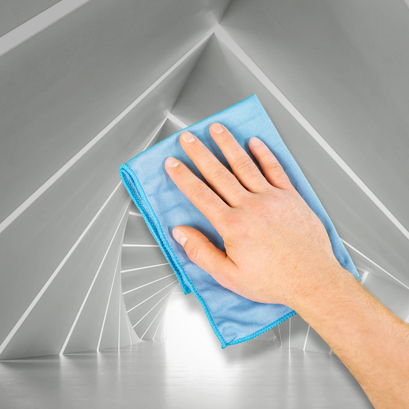 - Reinige eventuelle Verschmutzungen oder Kleberreste sofort mit einem feuchten Schwamm oder Tuch.