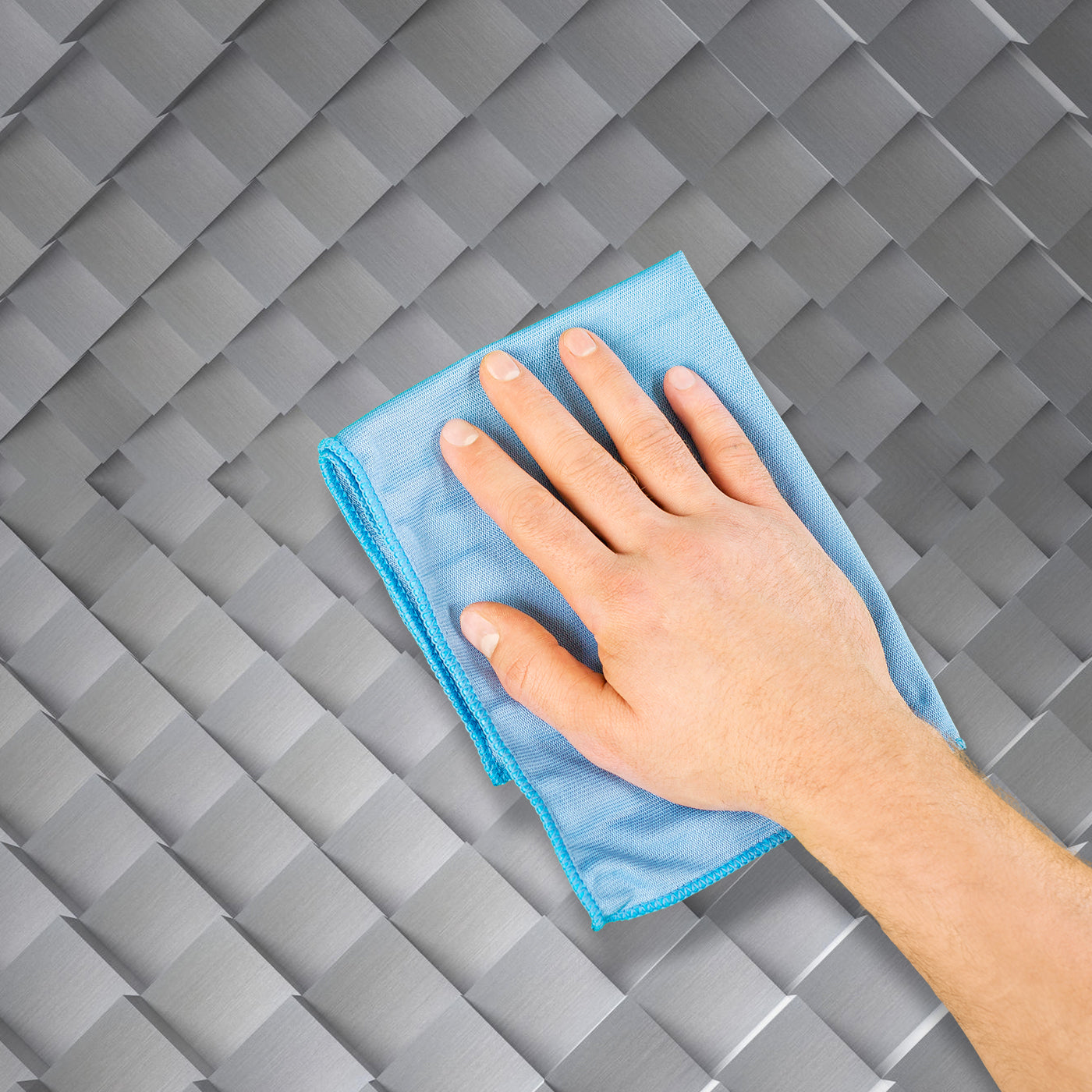 - Reinige eventuelle Verschmutzungen oder Kleberreste sofort mit einem feuchten Schwamm oder Tuch.