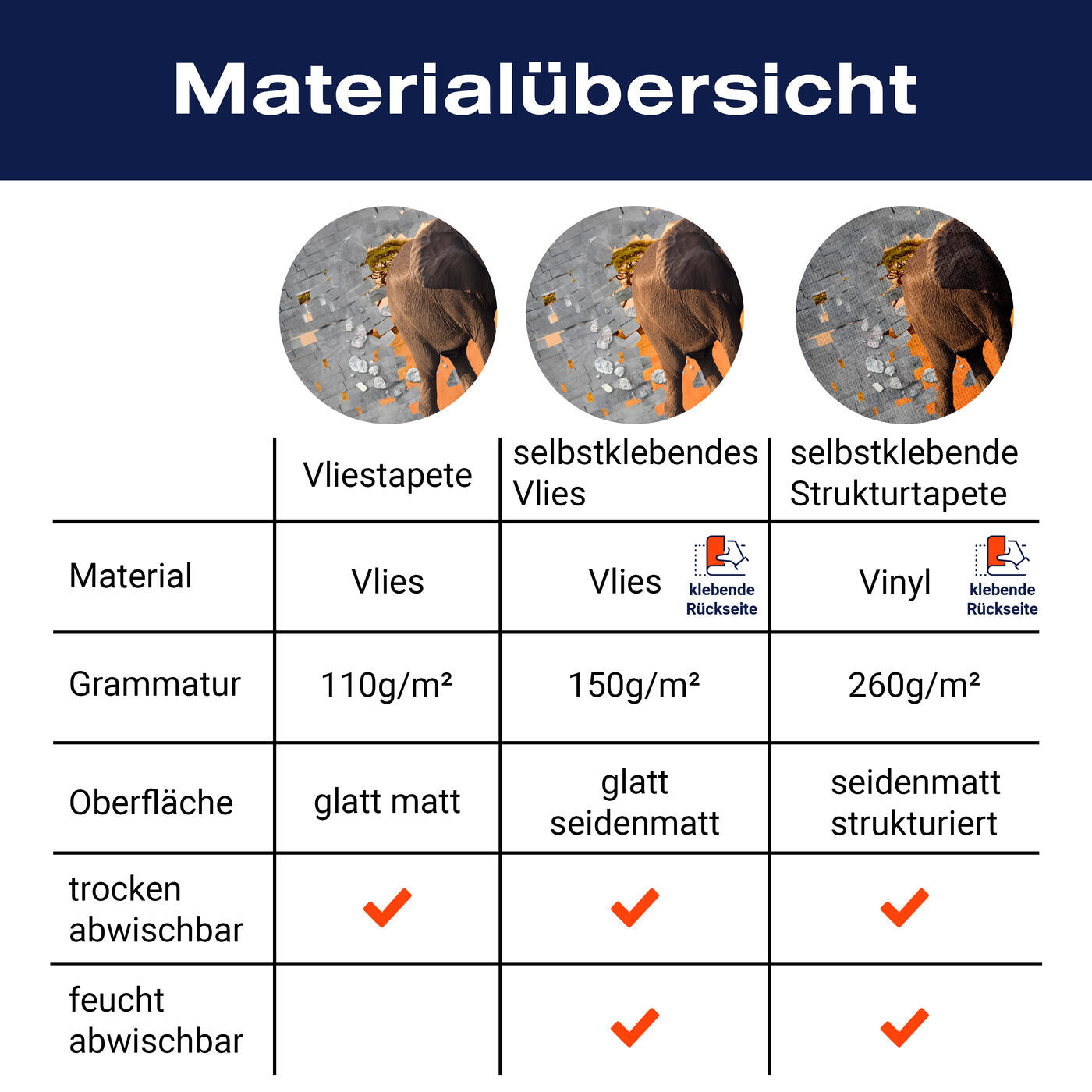 Die Fototapeten sind pflegeleicht und können mit einem feuchten Tuch gereinigt werden, ohne die Farbbrillanz zu beeinträchtigen.