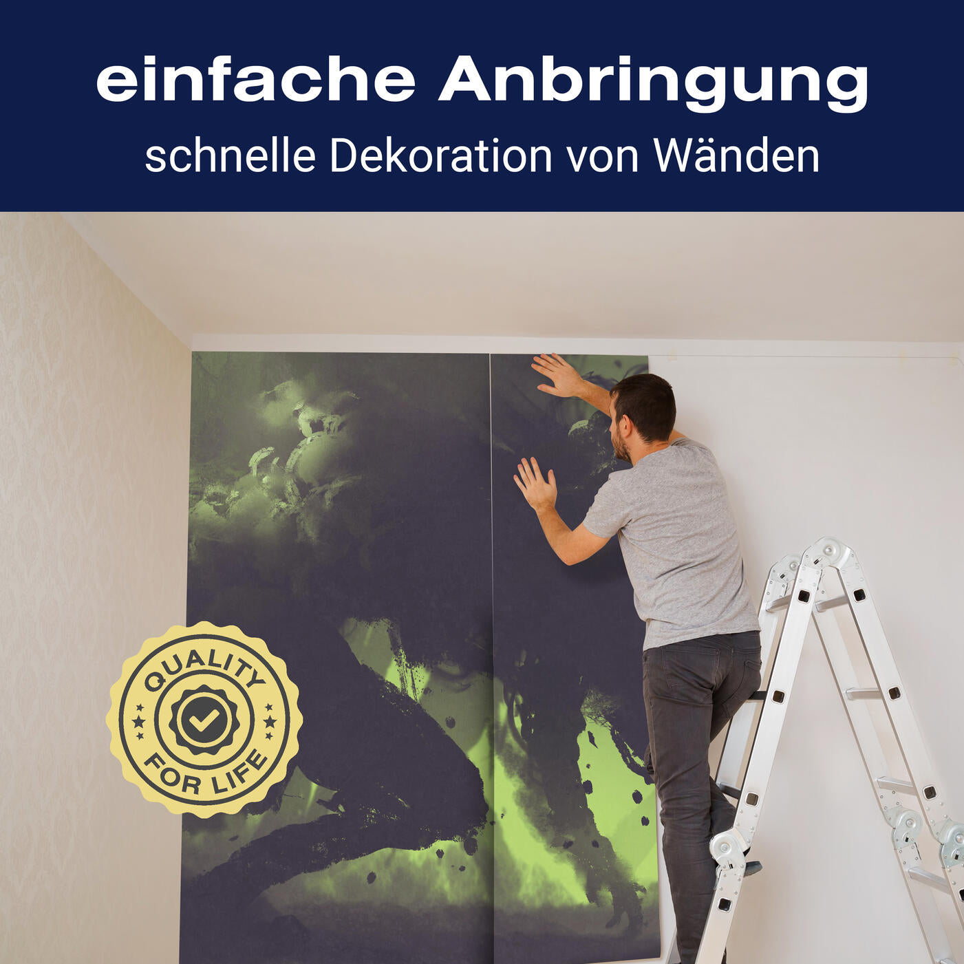 - Wenn deine Fototapete aus mehreren Bahnen besteht, achte darauf, dass die Motive oder das Design sauber und nahtlos ineinander übergehen. Achte dabei auf die Anweisungen des Herstellers oder auf eventuelle Markierungen auf der Tapete selbst.