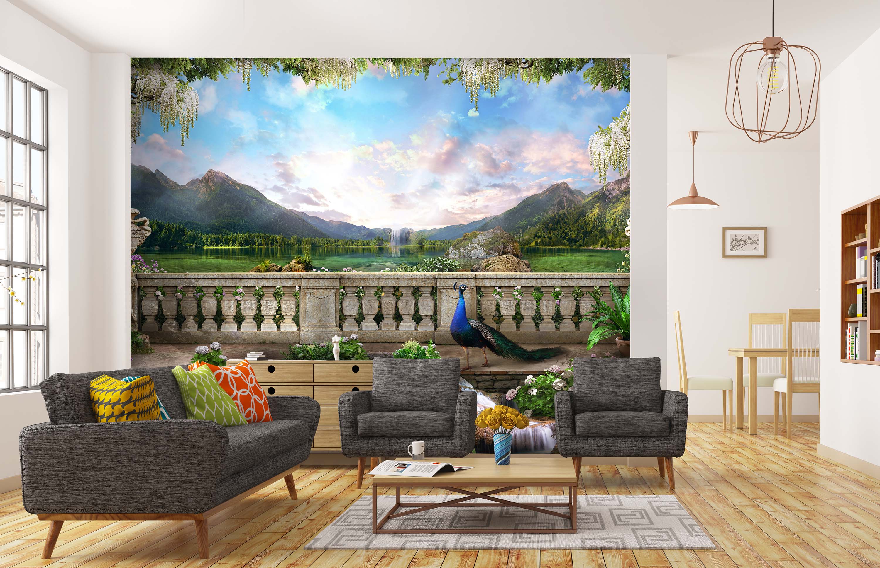 FOTOTAPETE Ausblick Berge Pfau Treppe Wasserfall