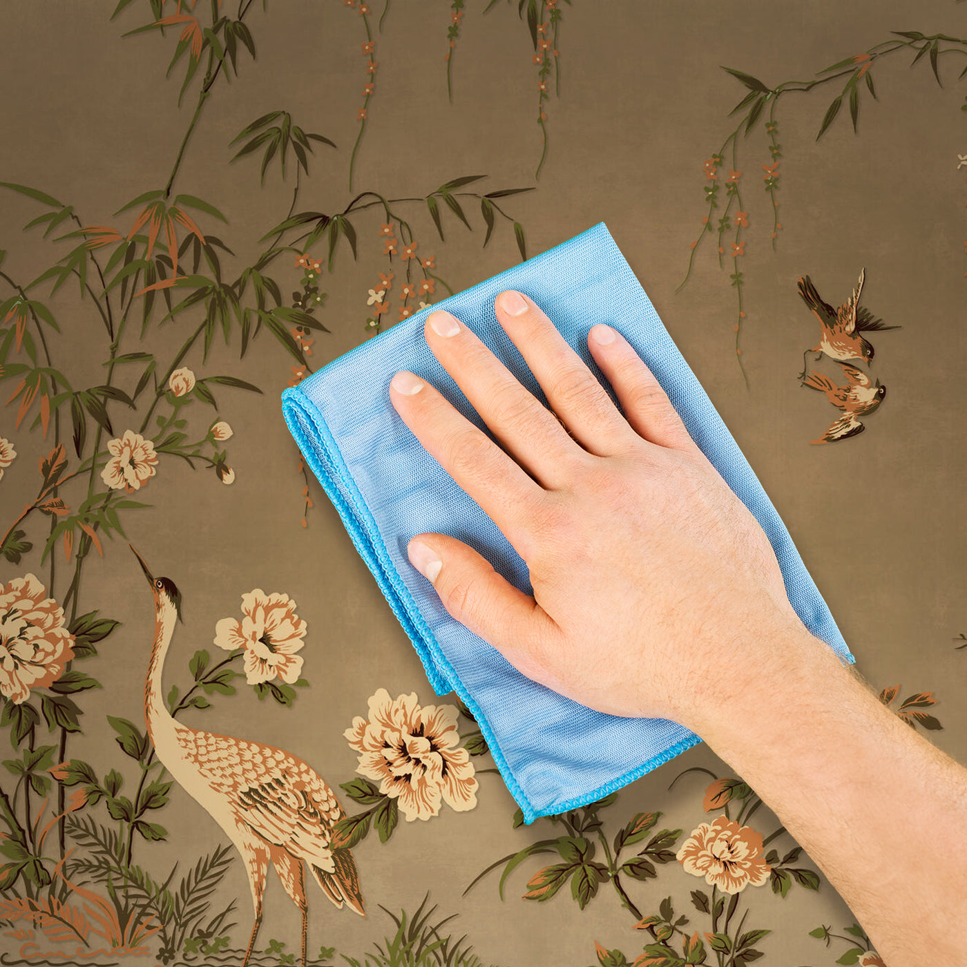 - Reinige eventuelle Verschmutzungen oder Kleberreste sofort mit einem feuchten Schwamm oder Tuch.