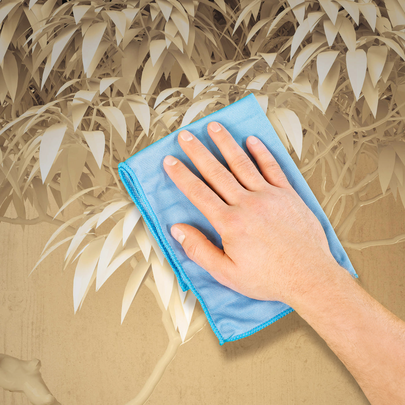 - Reinige eventuelle Verschmutzungen oder Kleberreste sofort mit einem feuchten Schwamm oder Tuch.