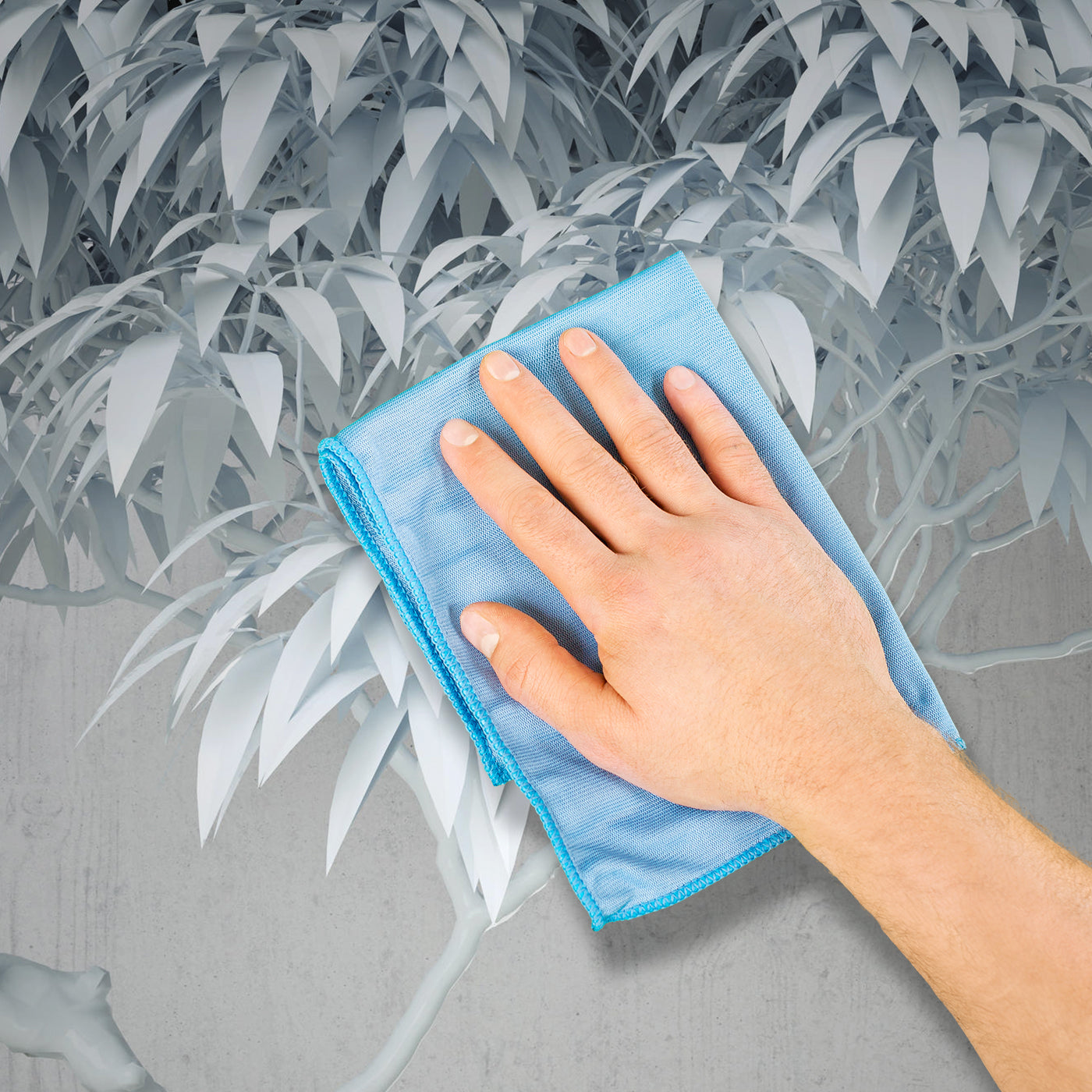 - Reinige eventuelle Verschmutzungen oder Kleberreste sofort mit einem feuchten Schwamm oder Tuch.