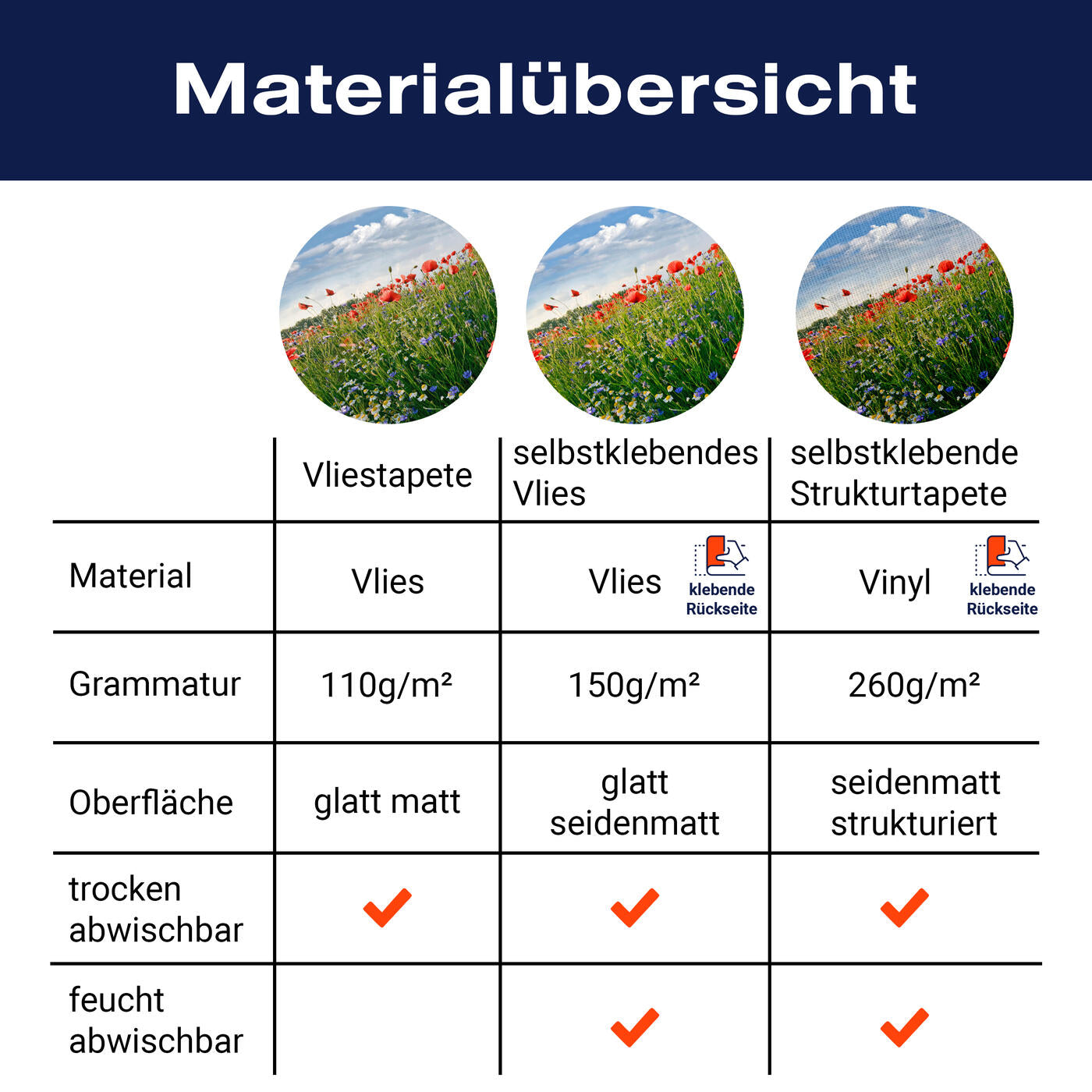 Die Fototapeten sind pflegeleicht und können mit einem feuchten Tuch gereinigt werden, ohne die Farbbrillanz zu beeinträchtigen.