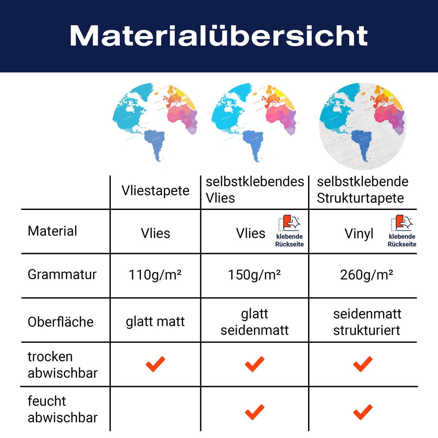 Die Fototapeten sind pflegeleicht und können mit einem feuchten Tuch gereinigt werden, ohne die Farbbrillanz zu beeinträchtigen.
