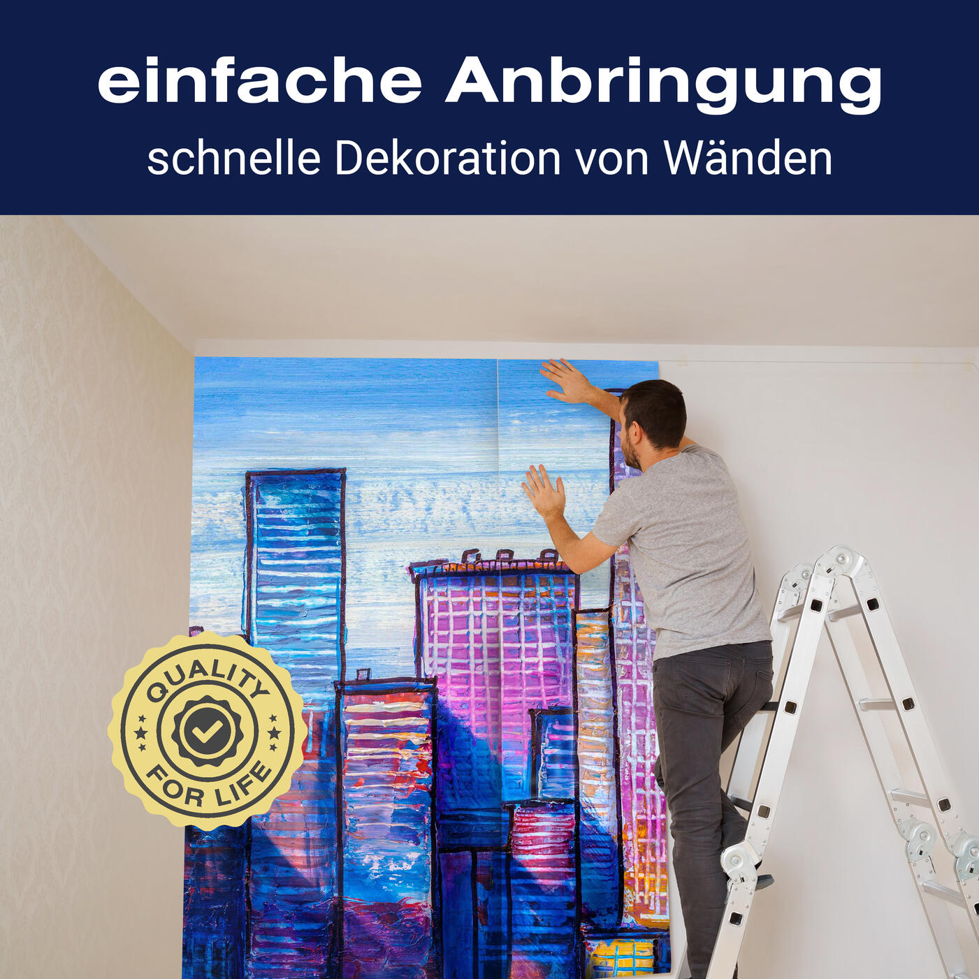 Träumst Du davon, Deine Wände in eine beeindruckende Kunstgalerie zu verwandeln? Mit unserer hochwertigen Fototapete Gemälde blaue Hochhäuser Stadt M5999 ist es jetzt möglich! Jede Wand wird zu einer Leinwand Deiner Kreativität.