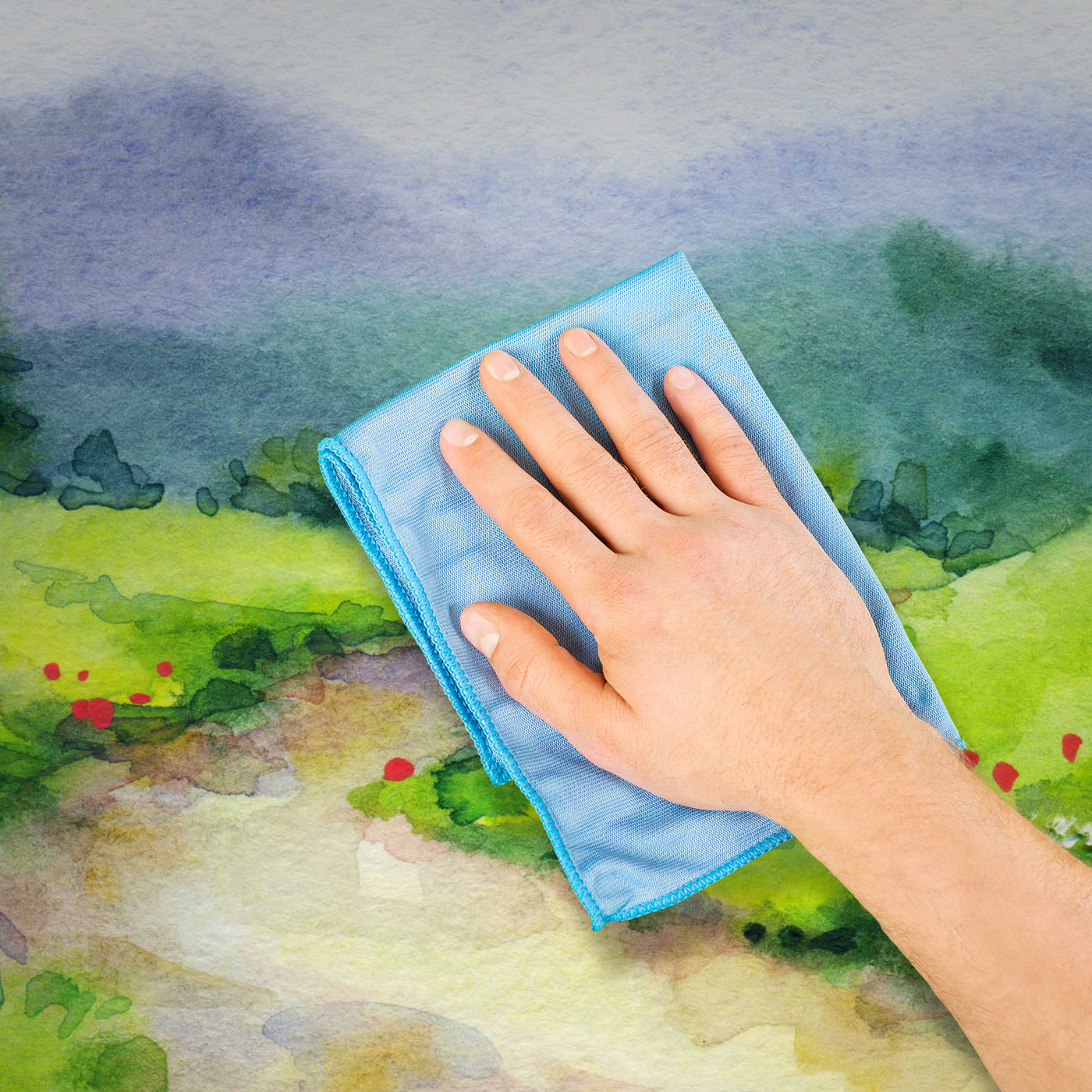 - Reinige eventuelle Verschmutzungen oder Kleberreste sofort mit einem feuchten Schwamm oder Tuch.