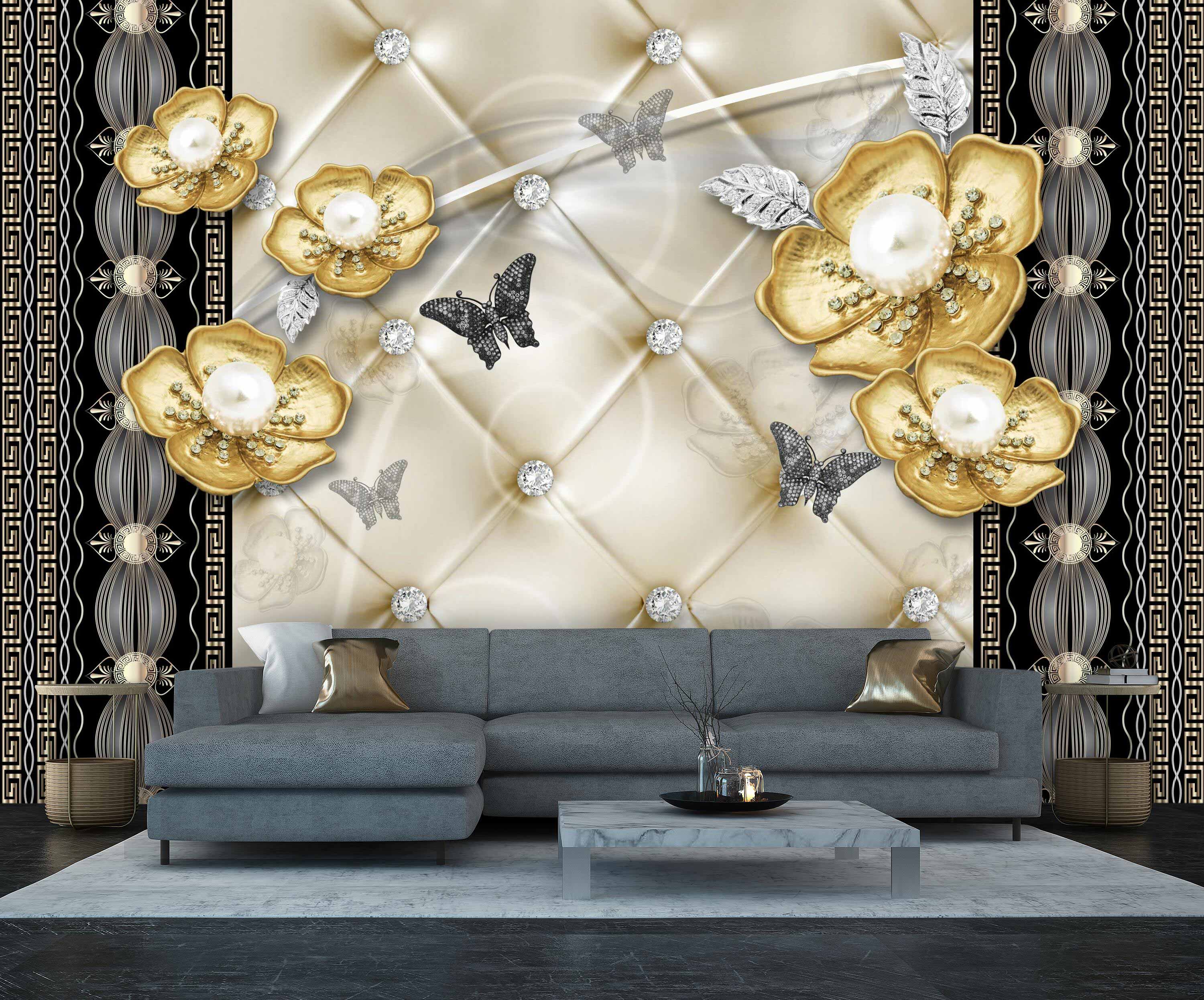 FOTOTAPETE Goldenen Blumen Silber Schmetterlinge