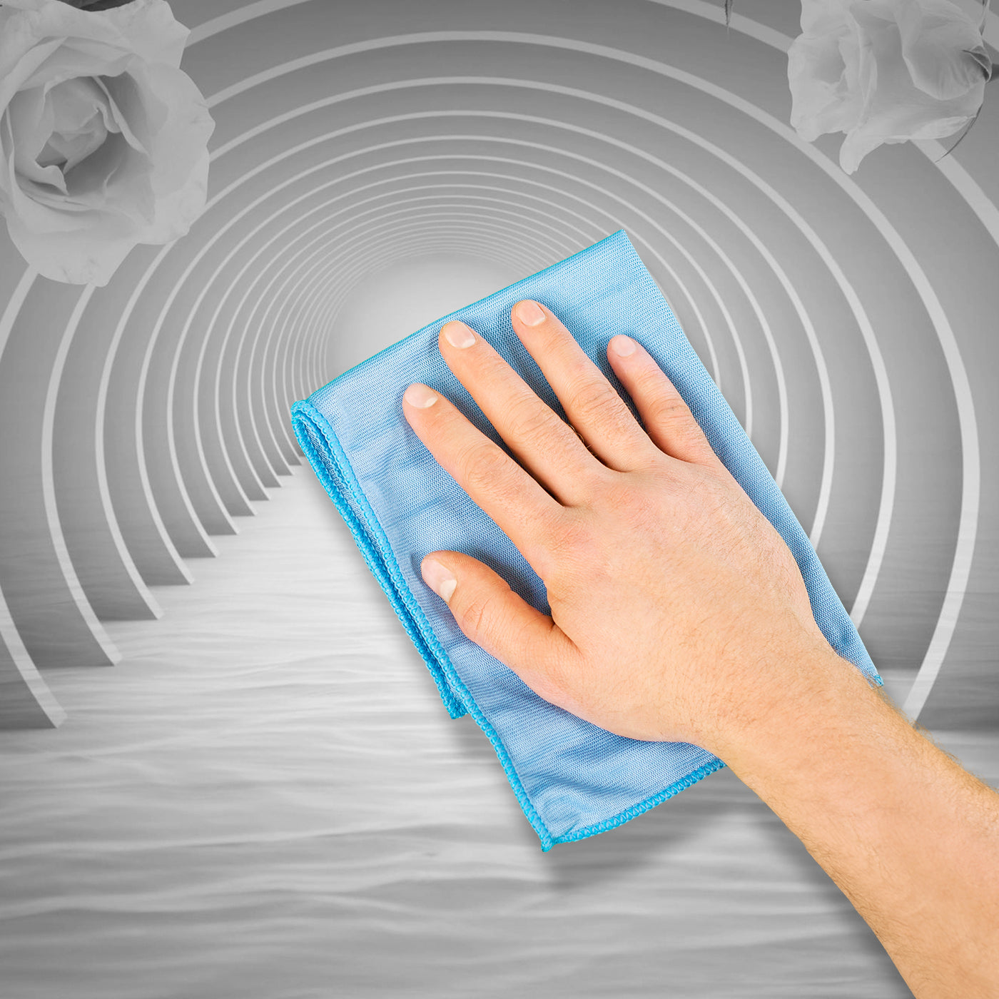 - Reinige eventuelle Verschmutzungen oder Kleberreste sofort mit einem feuchten Schwamm oder Tuch.