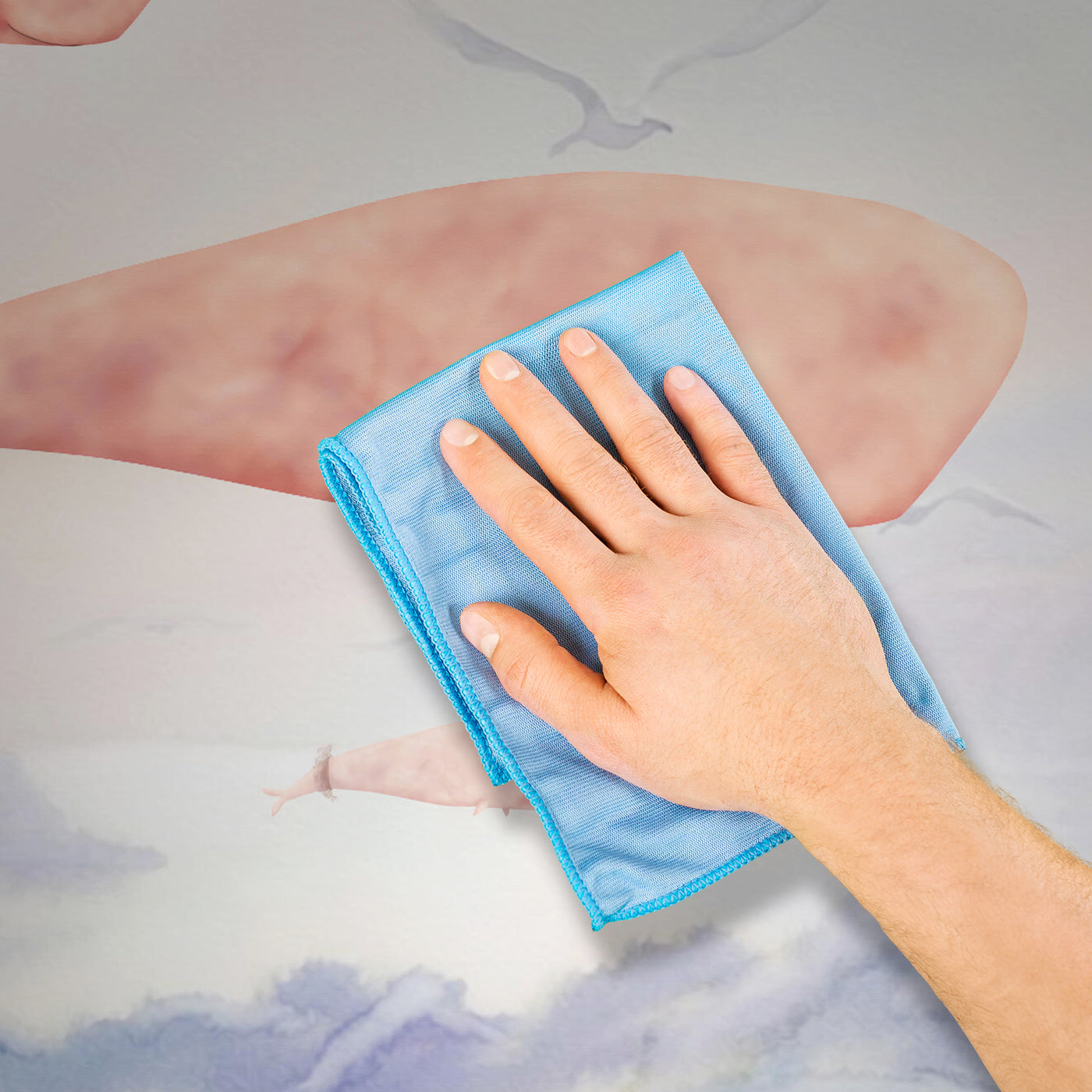 - Reinige eventuelle Verschmutzungen oder Kleberreste sofort mit einem feuchten Schwamm oder Tuch.