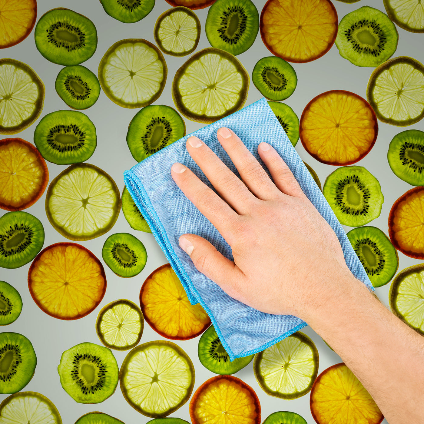 - Reinige eventuelle Verschmutzungen oder Kleberreste sofort mit einem feuchten Schwamm oder Tuch.