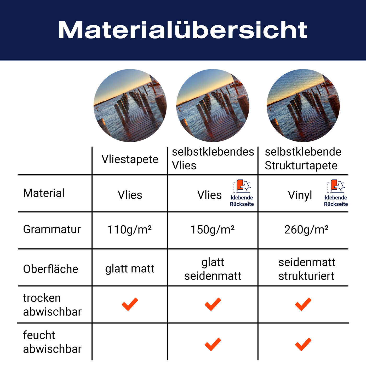 Die Fototapeten sind pflegeleicht und können mit einem feuchten Tuch gereinigt werden, ohne die Farbbrillanz zu beeinträchtigen.
