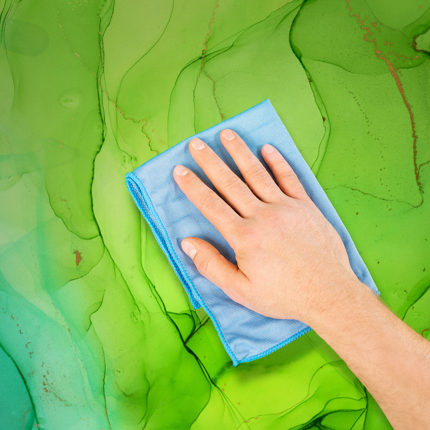 - Reinige eventuelle Verschmutzungen oder Kleberreste sofort mit einem feuchten Schwamm oder Tuch.