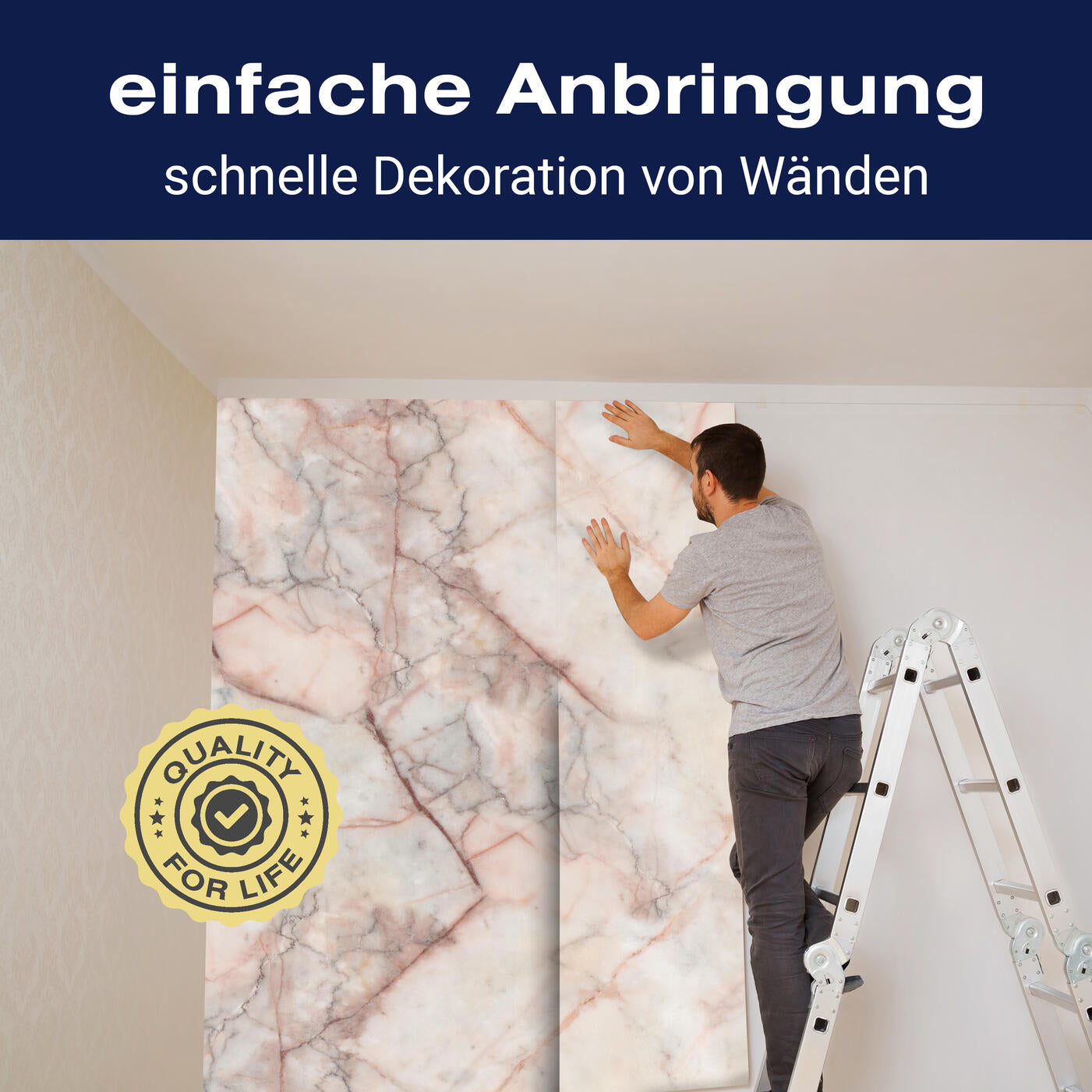 - Wenn deine Fototapete aus mehreren Bahnen besteht, achte darauf, dass die Motive oder das Design sauber und nahtlos ineinander übergehen. Achte dabei auf die Anweisungen des Herstellers oder auf eventuelle Markierungen auf der Tapete selbst.