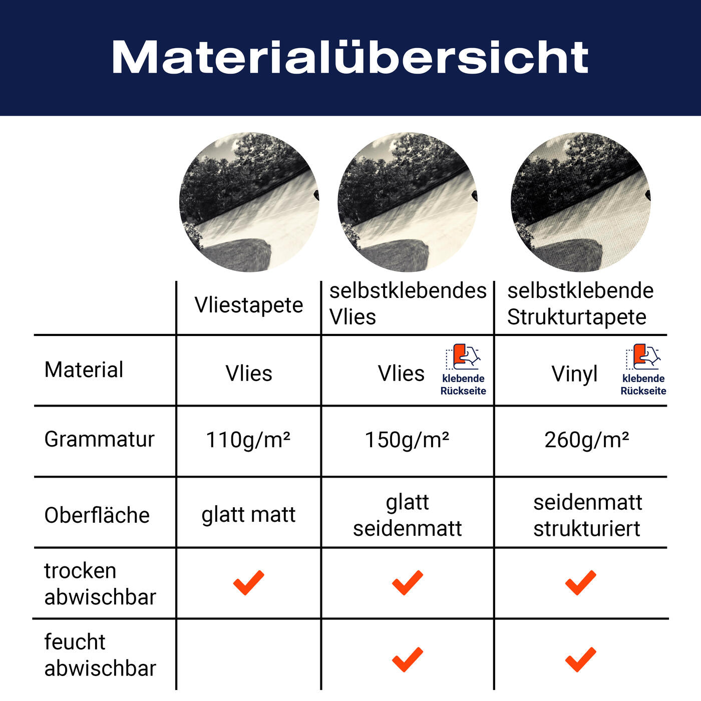 Die Fototapeten sind pflegeleicht und können mit einem feuchten Tuch gereinigt werden, ohne die Farbbrillanz zu beeinträchtigen.