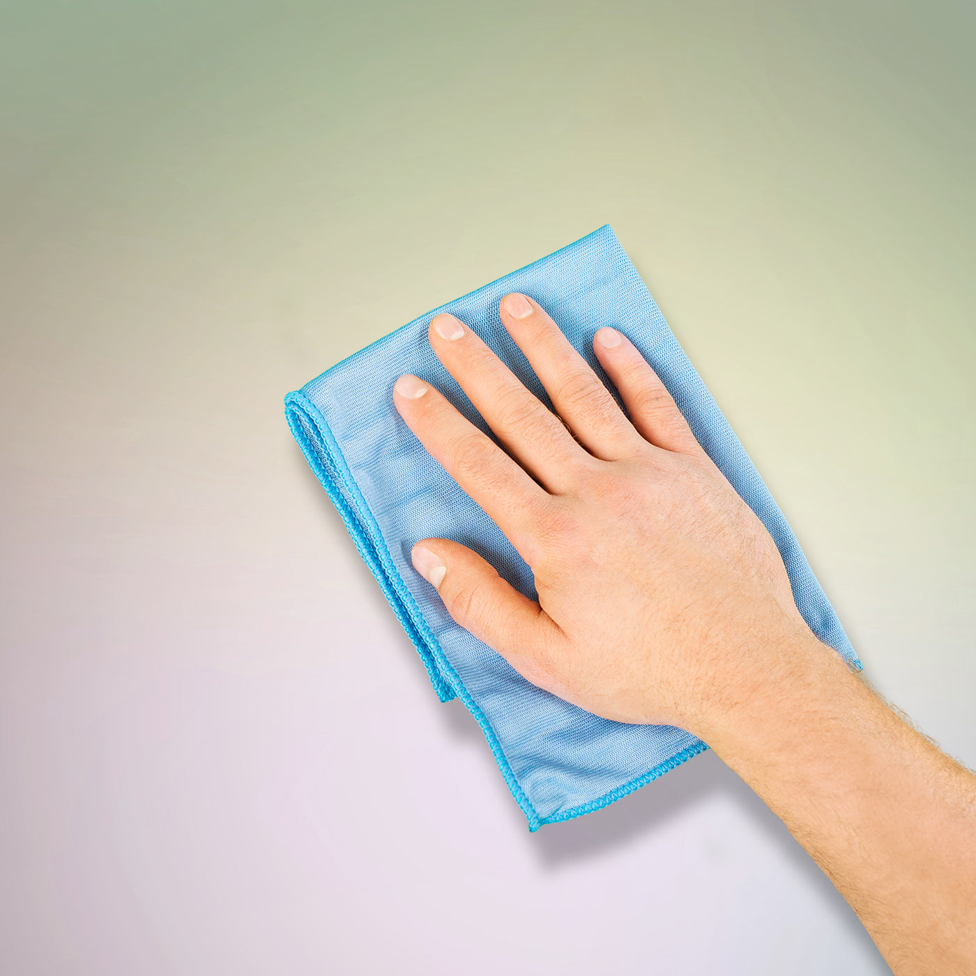 - Reinige eventuelle Verschmutzungen oder Kleberreste sofort mit einem feuchten Schwamm oder Tuch.
