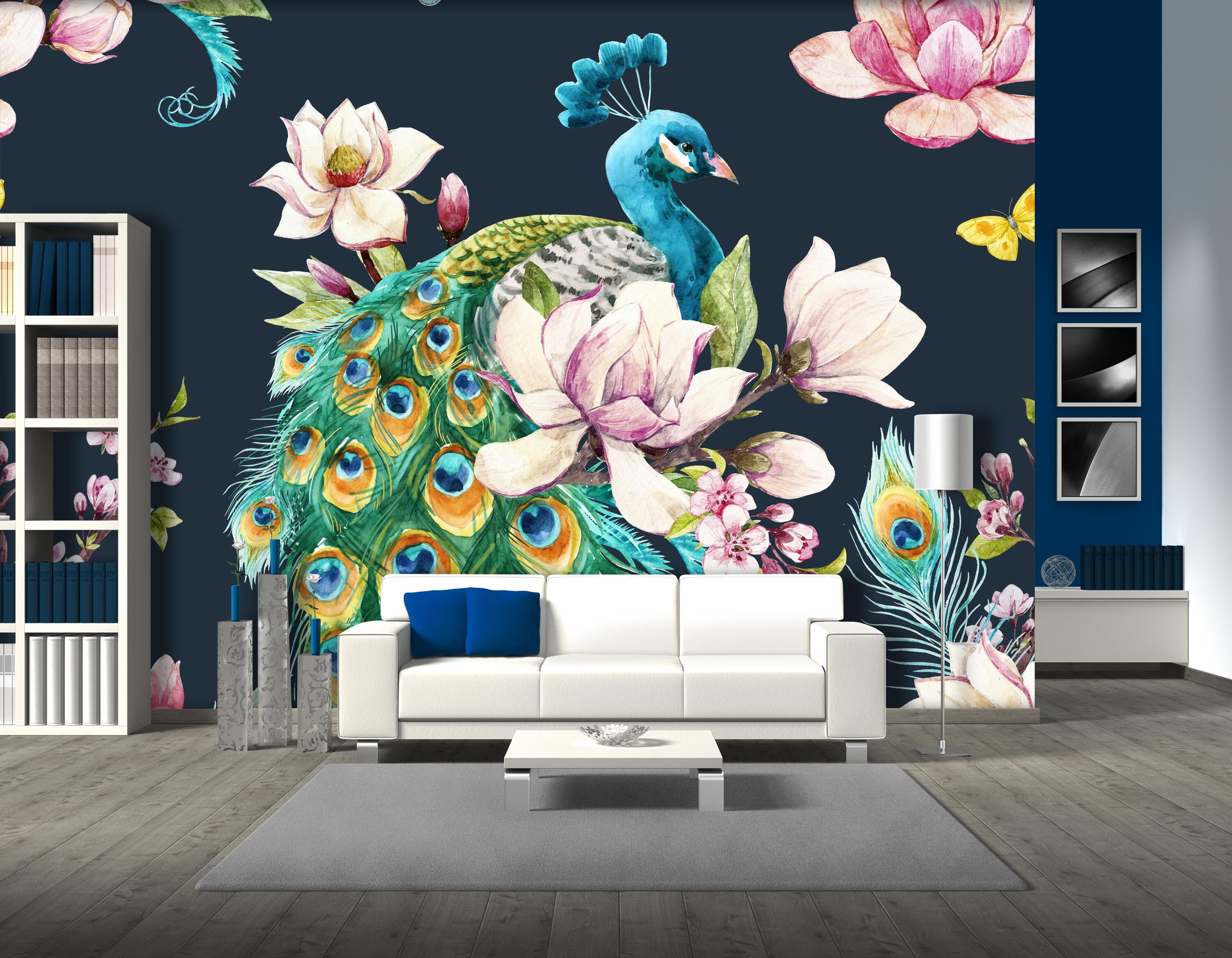 Fototapete Pfau Kunst Aquarell Blumen M6582