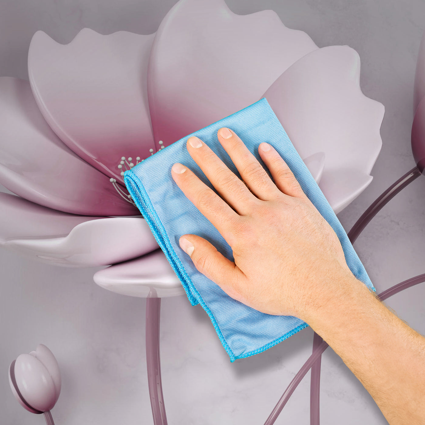 - Reinige eventuelle Verschmutzungen oder Kleberreste sofort mit einem feuchten Schwamm oder Tuch.