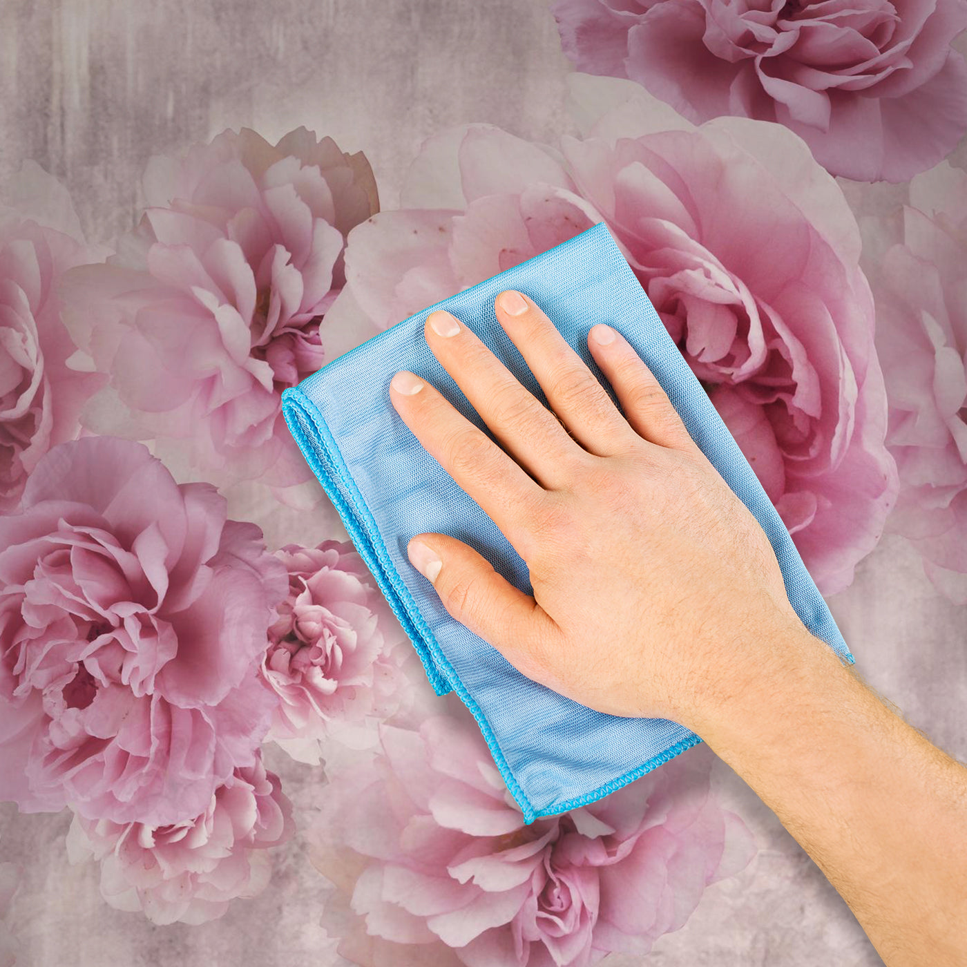 - Reinige eventuelle Verschmutzungen oder Kleberreste sofort mit einem feuchten Schwamm oder Tuch.